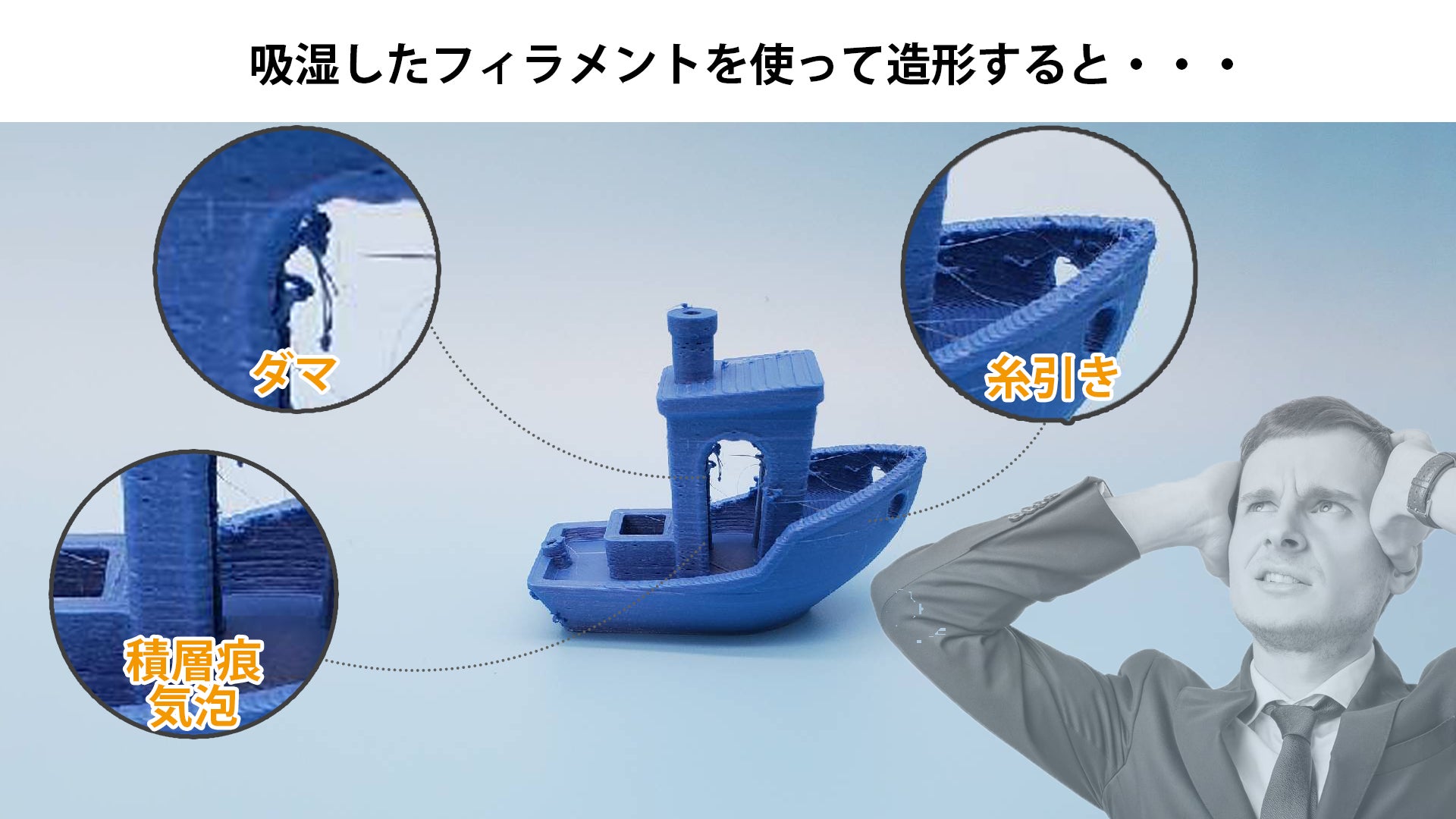 吸湿したフィラメントを使用すると、糸引きやダマ・積層痕や気泡などが発生し、