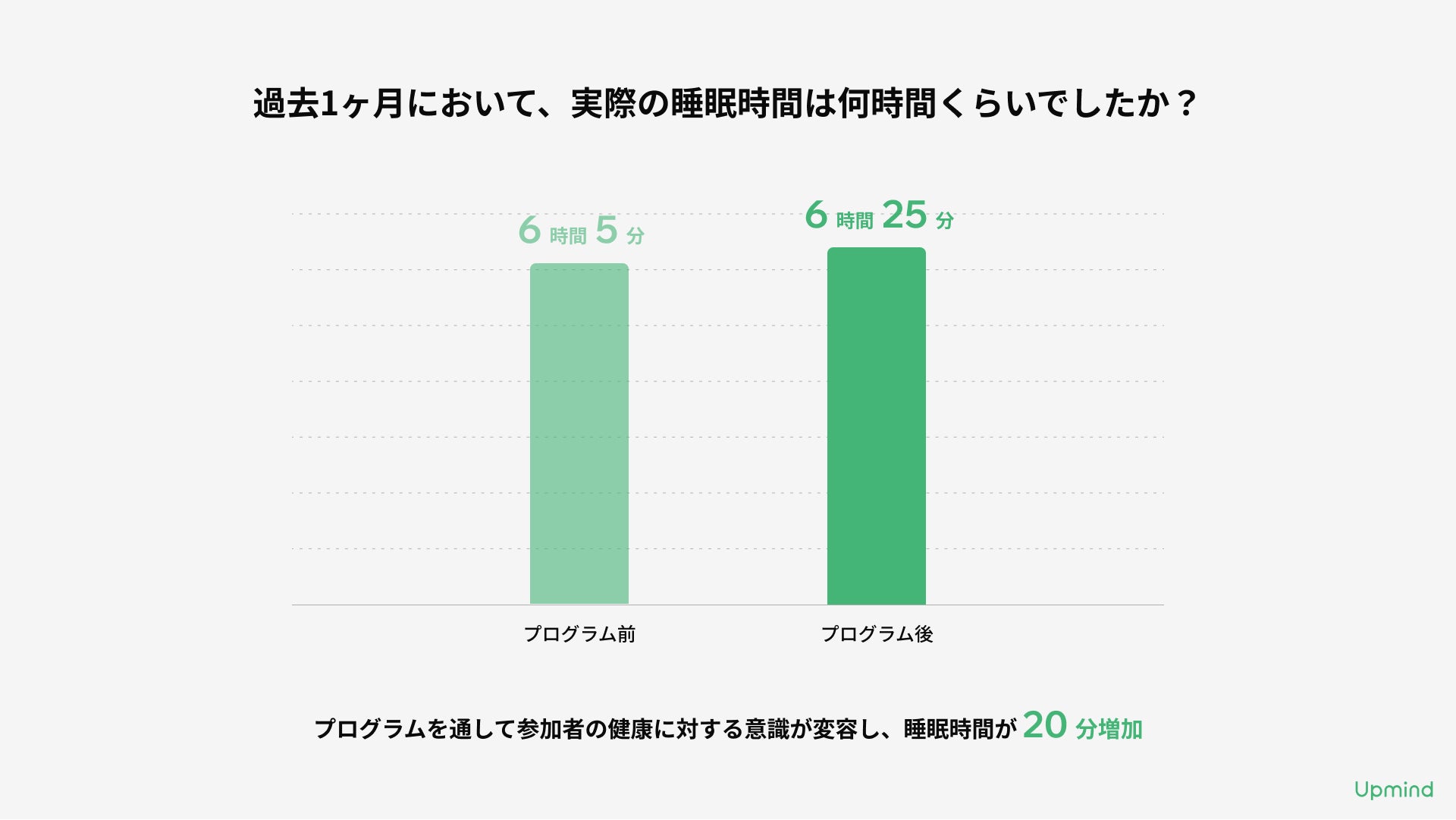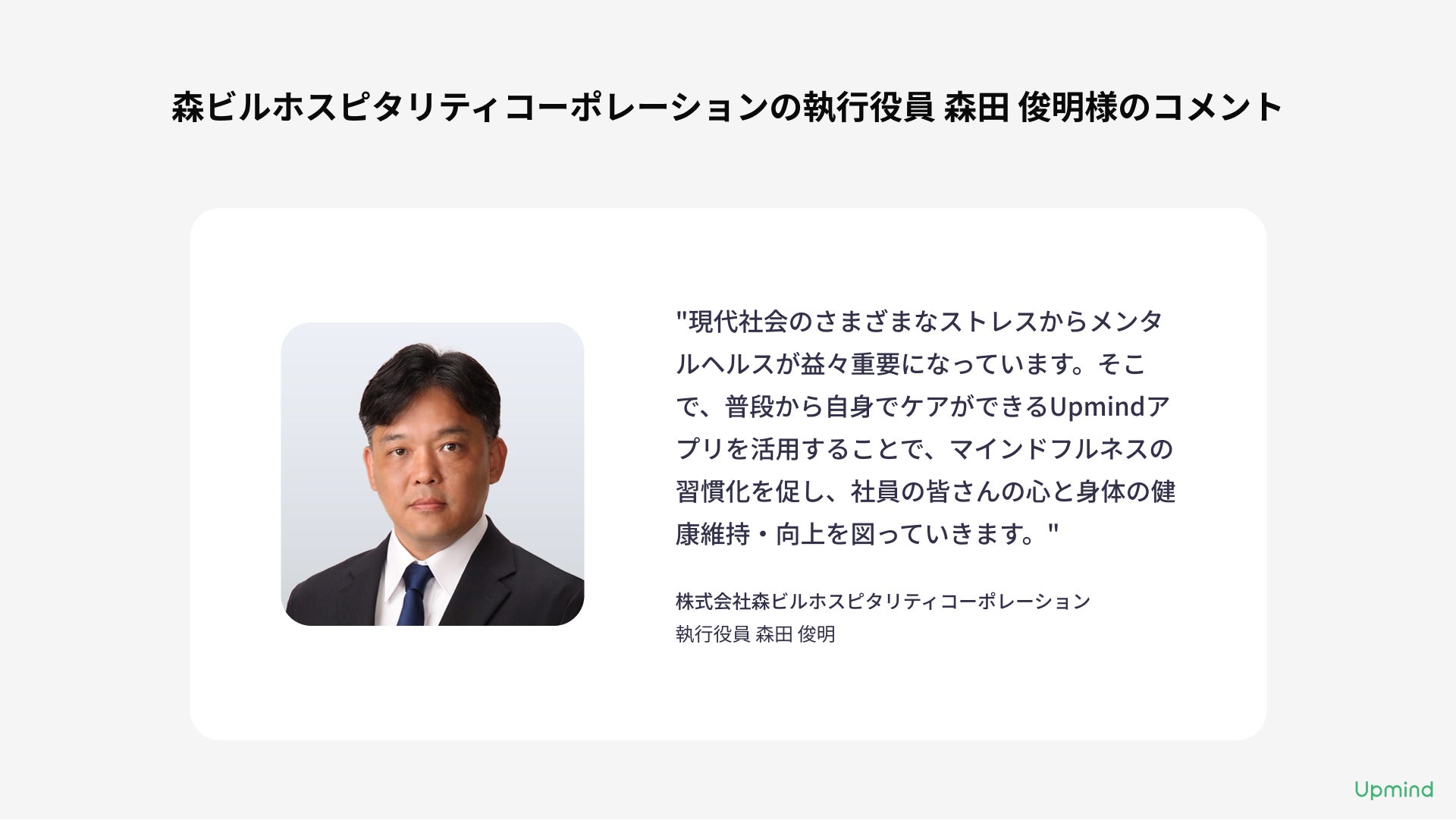 株式会社森ビルホスピタリティコーポレーションが、全社員向けにUpmindアプリの提供を開始。導入前の実証実験では、疲労感・ストレスが約16%減、睡眠時間20分増など大きな成果を確認