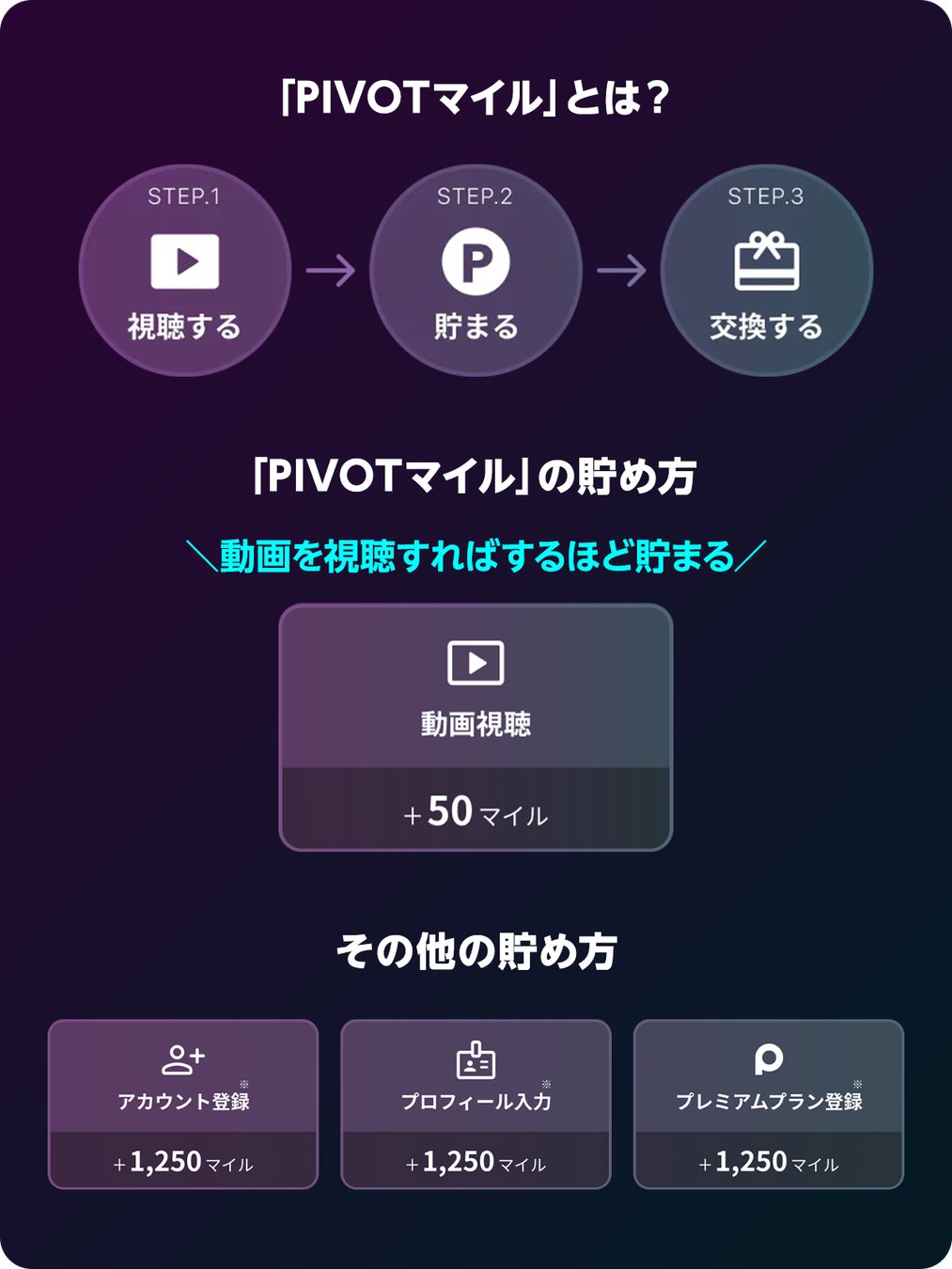 アプリ・Web上でのコンテンツ視聴やアクションを通じて「PIVOTマイル」を獲得できます。「PIVOTマイル」は、プレミアムプランの一ヶ月無料体験やイベント参加など、様々な特典と交換することが可能です。
