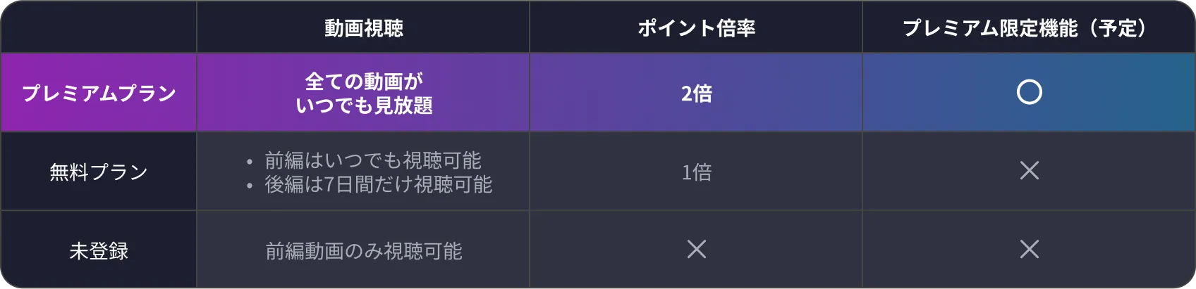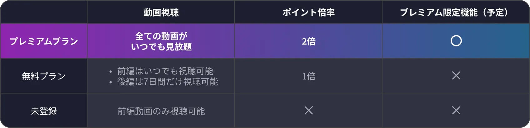プレミアムプラン加入者は、全てのコンテンツがいつでも見放題です。また、コンテンツ視聴やアクションを通じて、無料プランの2倍のマイルを獲得できます。