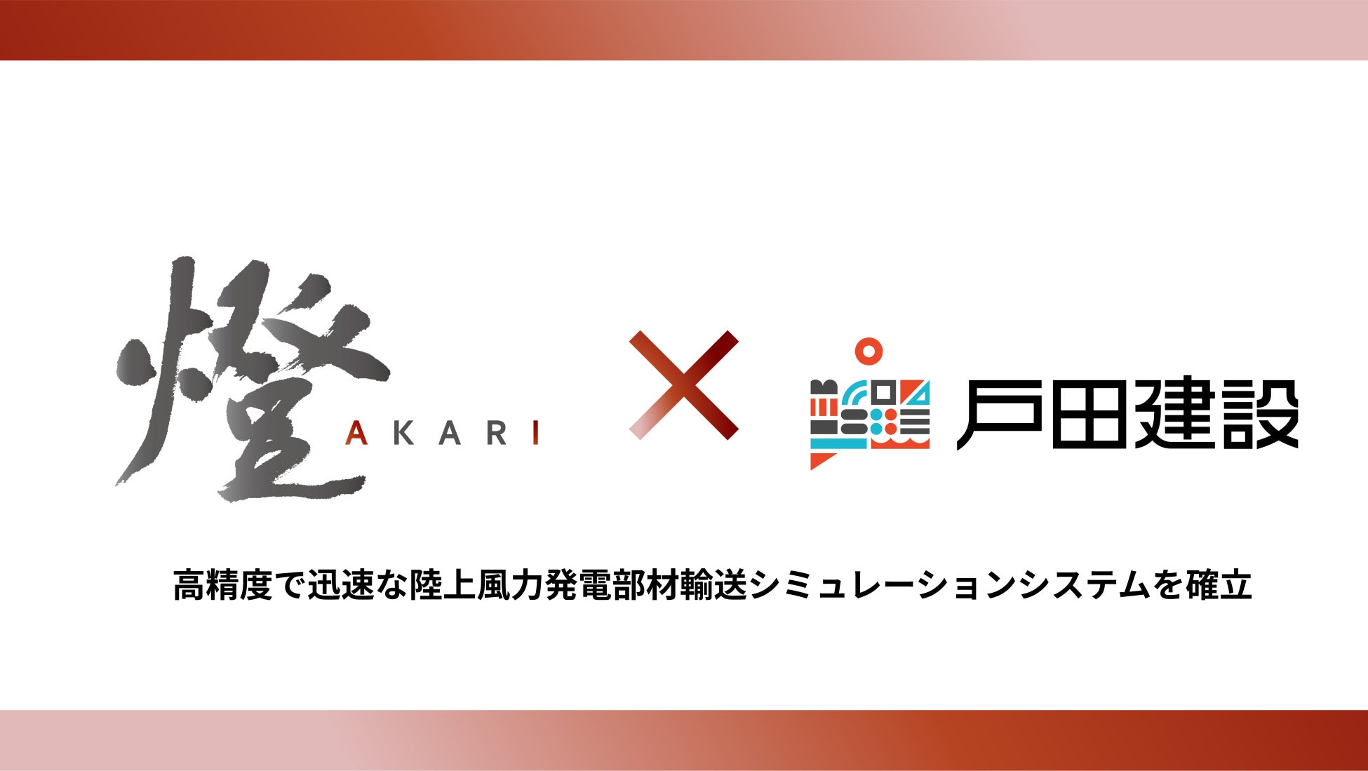燈はこれまで建設業界において、建物の3Dモデリング技術やシミュレーション技術を活用したソリューションを多数手掛け、技術を蓄積してまいりました。今回、燈独自のシミュレーション基盤上に点群処理や経路生成といったAIアルゴリズムを搭載し、陸上風力発電の部材輸送に特化したシミュレーションシステムを実現いたしました。大規模な建設データを取り扱える本システム基盤を活用し、将来的にさらなるアップデートを目指して参ります。今後も、3Dデータ処理技術やシミュレーション技術も含め、当社がこれまで培ったテクノロジーを活用し、建設業界の業務効率化により一層貢献してまいります。