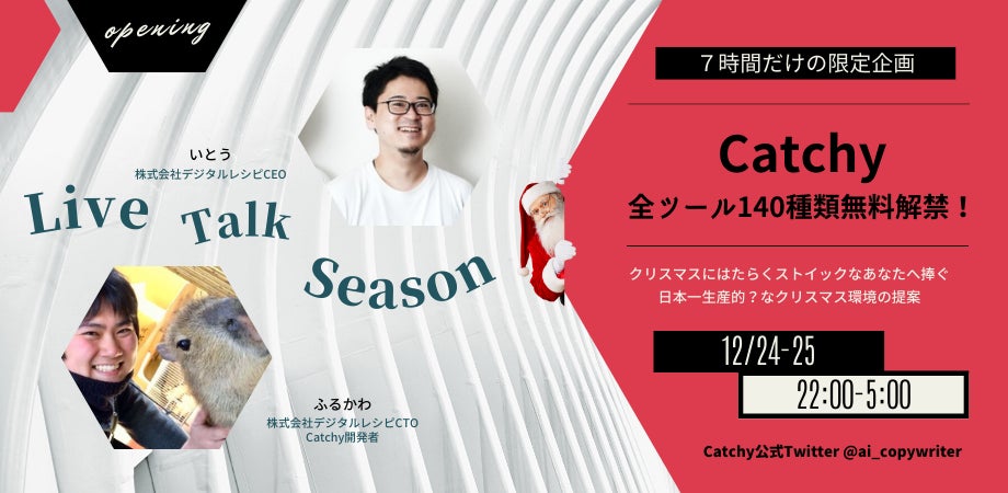 クリスマスにも働くあなたを応援!文章生成AI「Catchy」が12/24の22時から7時間限定で全140種類のツールを無料公開