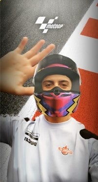 この新しいARレンズはMotoGP™レンズと呼ばれ、AR(拡張現実)で自分のヘルメットをデザインすることにより、MotoGP™ライダーになりきることができます。ヘルメットはライダーにとって重要な装備であり、個性を表現するものでもあります(レーサー達はレースキャリアの中で自身のオリジナルヘルメットをデザインしています)。Snapchatの新しいMotoGPレンズでは、世界中のファンが、プロのレーサーと同じように自分だけのヘルメットをデザインすることができます。好きな色の選択、最も人気のデザインの選択、面白いステッカーの追加まで、ファンは創造性を駆使して、世界最速のモーターサイクルレース選手権のレーサーになりきって、その作品をコミュニティと共有することができます。
