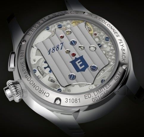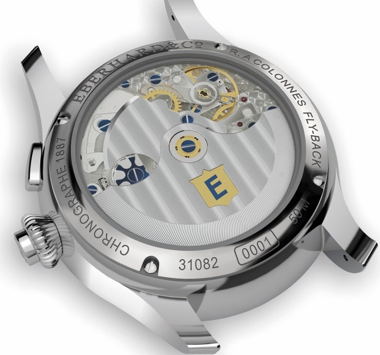 メゾンの象徴である盾の形にコート・ド・ジュネーブ仕上げを施し、「1887」(メゾンの創業年)と「E」のエンボスを囲む盾を刻印。クロノグラフ歯車列の専用アッパーブリッジを製作。