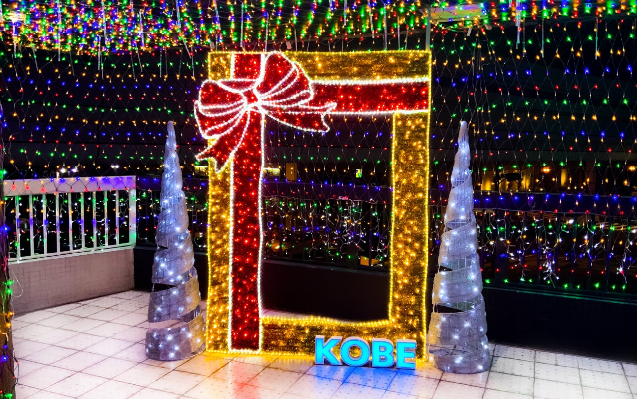 歩道橋のイルミネーションの中には、特別なフォトスポットも設置。プレゼントのようなフォトフレーム型イルミネーションが輝き、足元には「BE KOBE」のオブジェが。神戸観光の思い出を華やかな光とともに写真に収めるのにぴったりのスポットです。