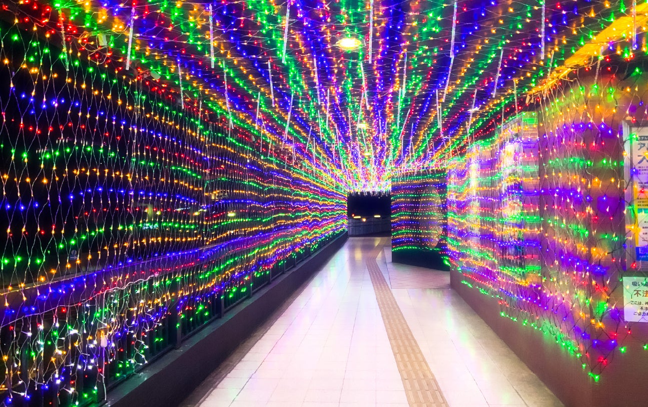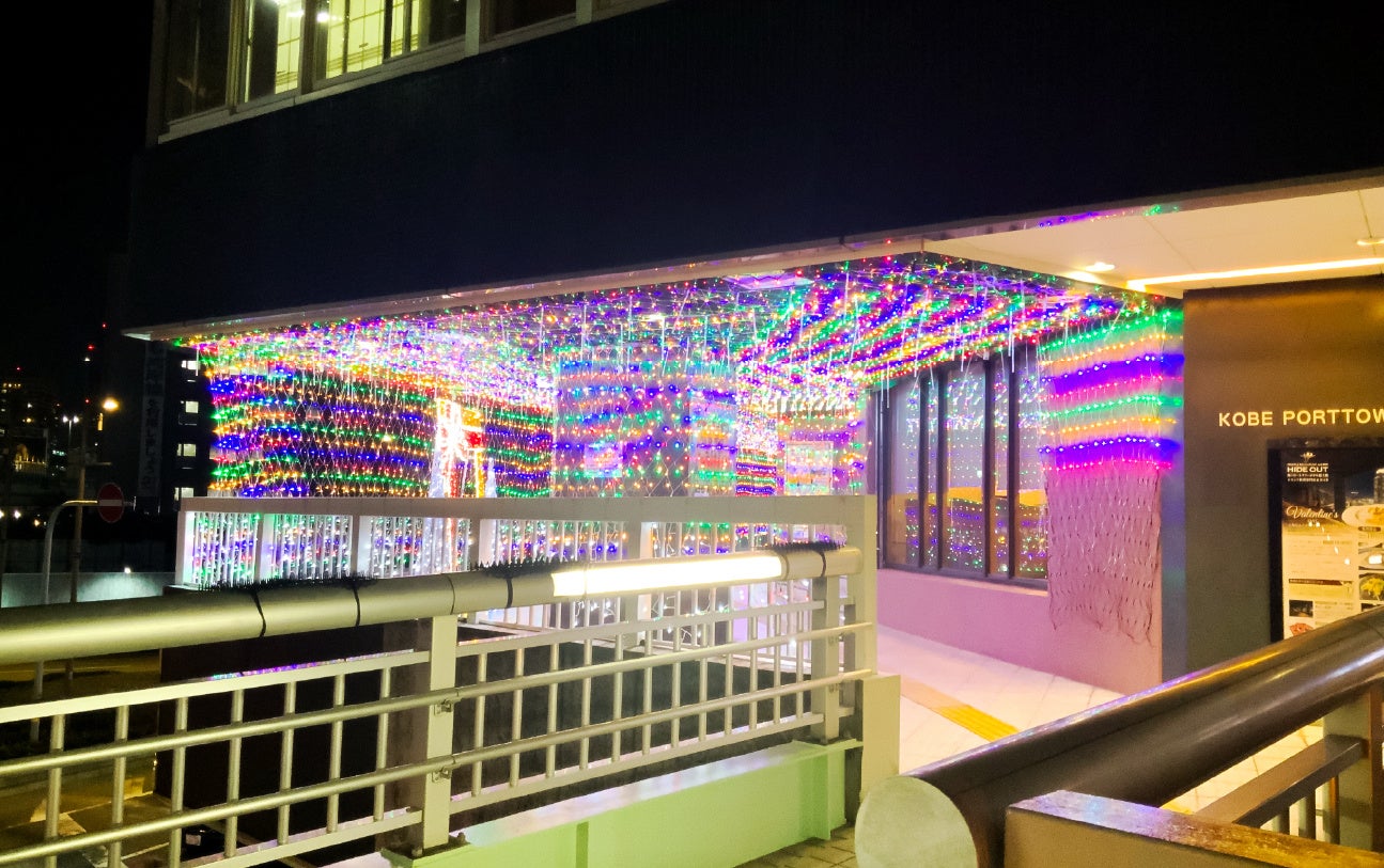 神戸ポートタワーホテルの2F出入口へ続く歩道橋が光のトンネルに生まれ変わりました。国道2号線をまたぐこの橋は今回のイルミネーションによって夜の神戸を彩る新たな名所に。赤・青・緑・白の電飾が輝き、まるで光のトンネルを歩いているかのような幻想的な空間を演出します。