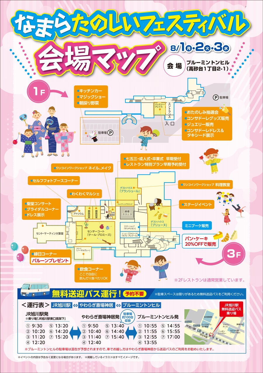 株式会社あいプラン(北海道札幌市・代表取締役・新道喜信) が、2022年8月1日(月)-3日(水)にブルーミントンヒル(旭川市)で『なまらたのしいフェスティバル』を開催いたします。みんな笑顔でハッピーになれる催しとして様々な企画をご用意いたしました。ご家族・お友達など皆様お誘いあわせの上、ご参加ください。
