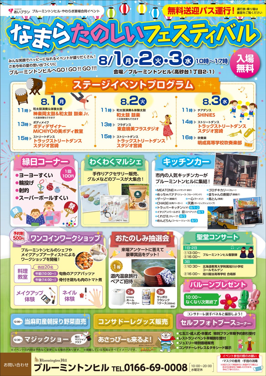 2022年8月1日(月)-3日(水)に旭川・ブルーミントンヒルで『なまらたのしいフェスティバル』を開催いたします。和太鼓やストリートダンスなどのステージイベントや、ご家族で楽しめる縁日コーナーやお楽しみ抽選会、話題のグルメを販売するキッチンカー、わくわくマルシェなど様々な催しをご用意しております。参加無料。