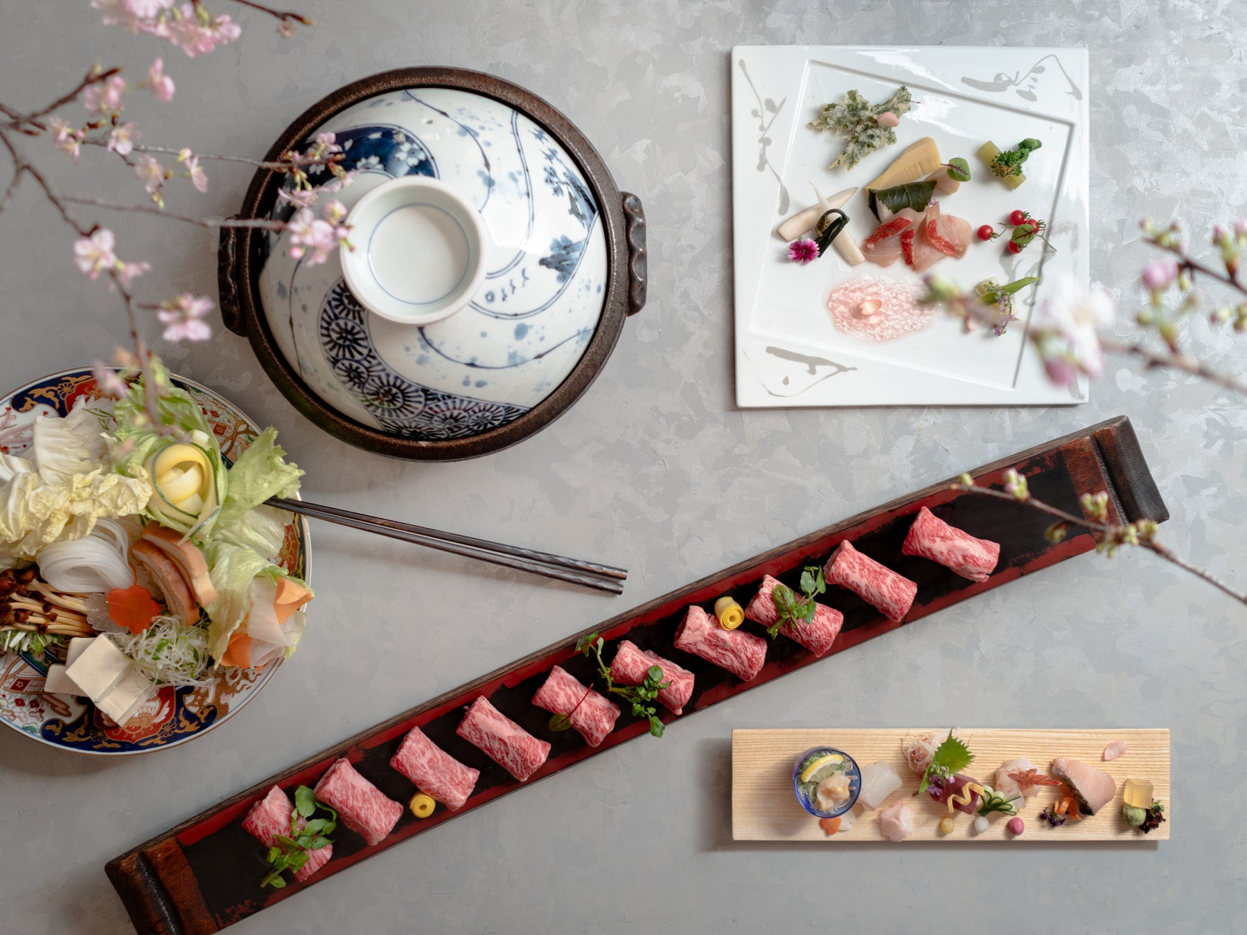 南足柄市の自然豊かな地で大切に育てられた黒毛和種の「相州和牛」は、月に数頭程しか流通しないため、その希少さから「幻」と称されるほど。春季限定プランのしゃぶしゃぶコースでは、薄くスライスした牛ロースを昆布だしと鶏がらスープの合わせ出汁にさっとくぐらせ、全体をほんのりと桜色にすることで、相州和牛のとろけるようなくちどけ感をお愉しみいただけます。さらに、付け合わせの野菜と相州和牛の持つ極上の旨みが次第に出汁へ溶け込んで、締めのきしめんまでもが格別の味わいに。全卓個室仕様のダイニングにて、心ゆくまで旬の美食にひたるひとときをお過ごしください。