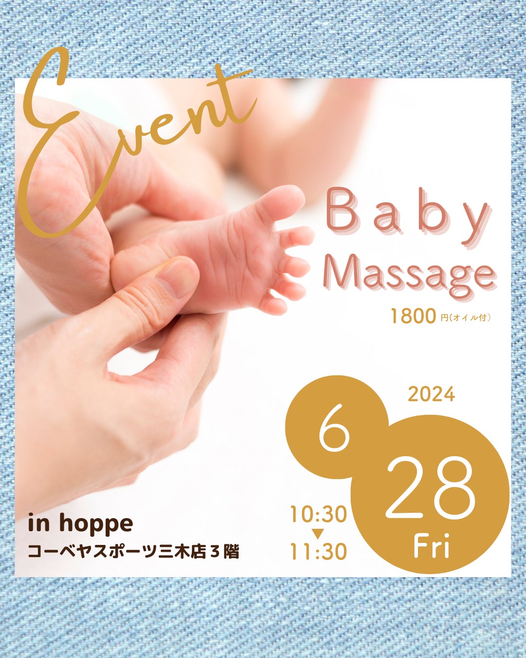 特定非営利活動法人ほっぺ(代表:大森 奈津子)は親子向けイベントとして、2024年6月28日(金)にhoppe(コーベヤスポーツ三木本店3階)にて、ベビーマッサージ体験ができる「Baby Massage in hoppe」を開催いたします。