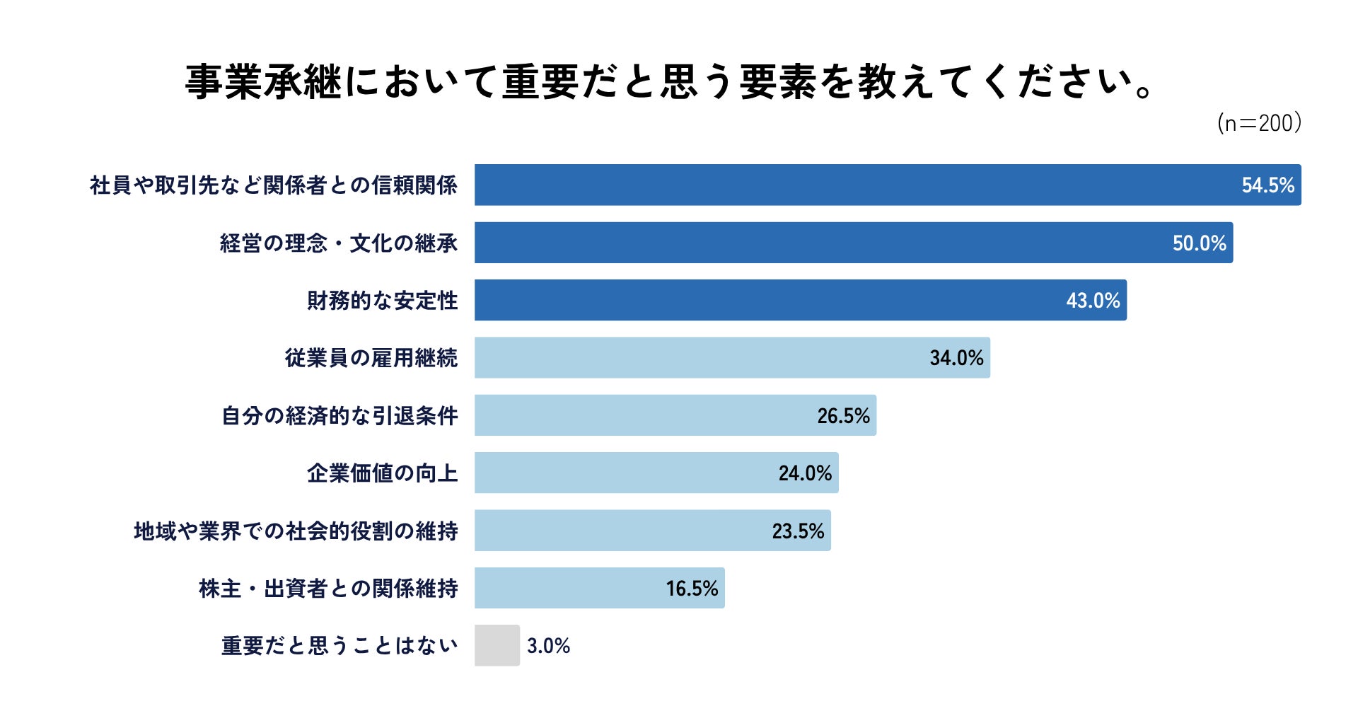 事業承継において重要だと思う要素を尋ねたところ、「社員や取引先との信頼関係」が54.5%で最も多く、「経営の理念・文化の継承」が50.0%、「財務的な安定性」が43.0%と続きました。経営基盤の安定と関係性の継続が重視されていることが明らかになりました(n=200)。