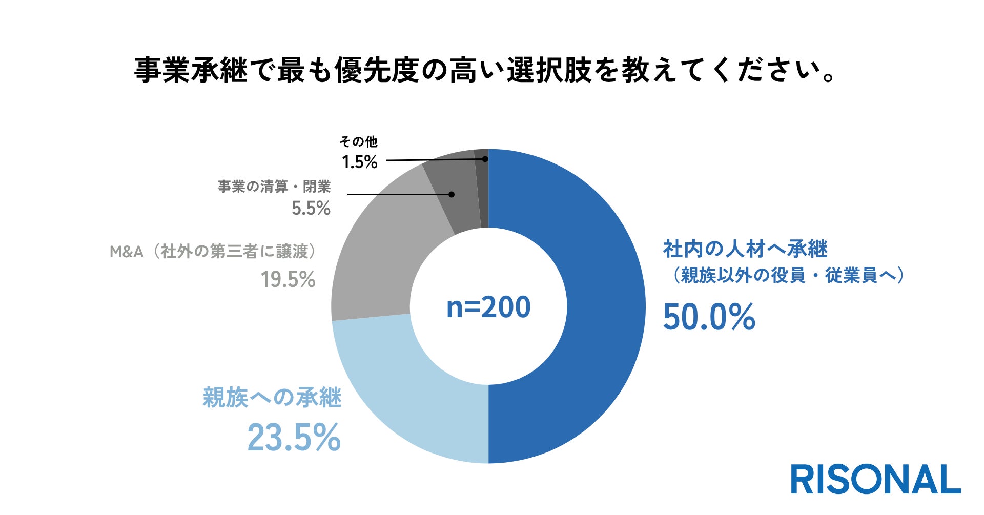 事業承継の優先順位について尋ねたところ、「社内の人材へ承継」が50.0%と最多で、「親族への承継」が23.5%、「M&A」が19.5%と続きました。この結果から、経営者の多くが、信頼する社内人材への承継を理想と考えていることが明らかになりました(n=200)。