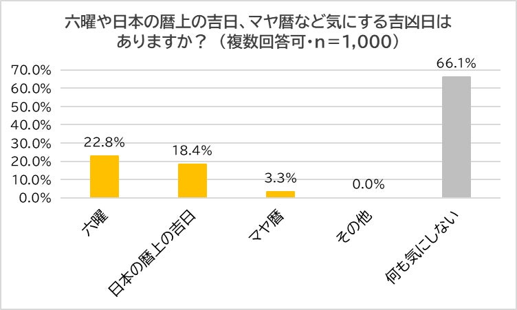 「六曜(大安・友引・先勝・先負・赤口・仏滅)や一粒万倍日、天赦日など日本の暦上の吉日、マヤ暦など気にする吉凶日はあるか?」と聞いたところ、7割弱(66.1%)が「何も気にしない」と回答したものの、「六曜」(22.8%)、「日本の暦上の吉日」(18.4%)、「マヤ暦」(3.3%)となり、3割超が何かしらの吉凶日を気にしていることがかわりました。
