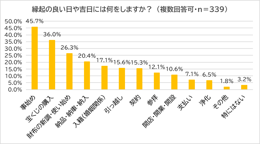 続いて、「縁起の良い日や吉日には何をするか?」聞きました。最も多かったのは「事始め」(45.7%)となり、「宝くじの購入」(36.0%)、「財布の新調・使い始め」(26.3%)、「納品・納車・納入」(20.4%)、「入籍(婚姻関係)」(17.1%)と続きました。吉日は、新たに何かを思い切って始めるきっかけになっているようです。
