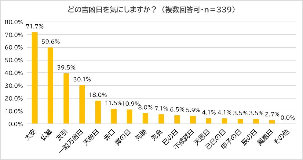 何かしらの吉凶日を気にする339人に「どの吉凶日を気にするか?」聞いたところ、7割超(71.7%)が「大安」(35.6%)と回答、以下「仏滅」(59.6%)、「友引」(39.5%)、「一粒万倍日」(30.1%)、「天赦日」(18.0%)となりました。