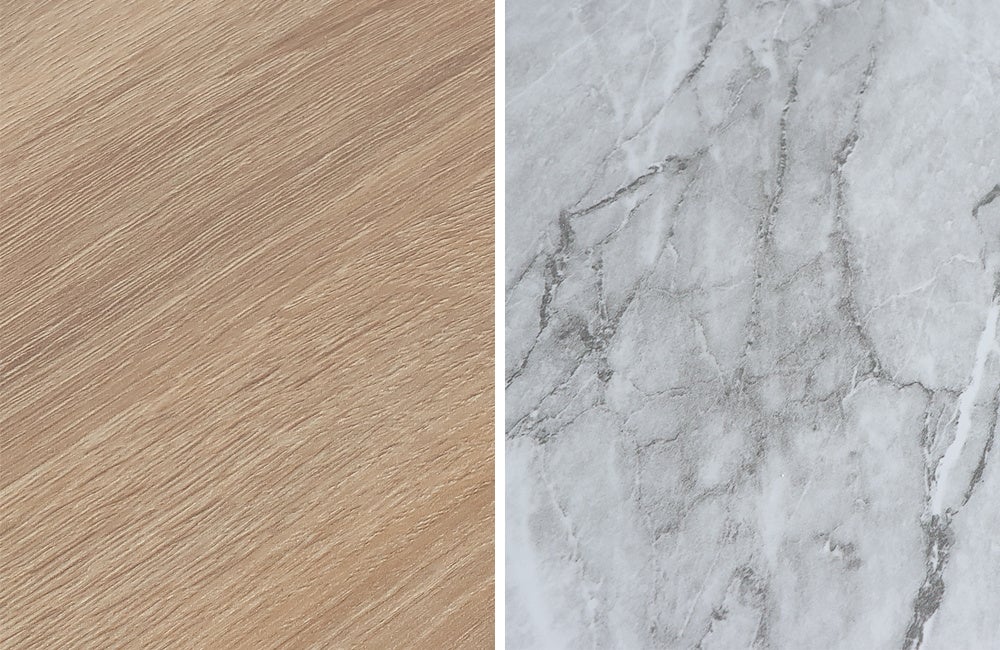 美しいマーブル模様の大理石が空間をより上質に、シンプルで素直な木目はあたたかみのある空間をつくります。