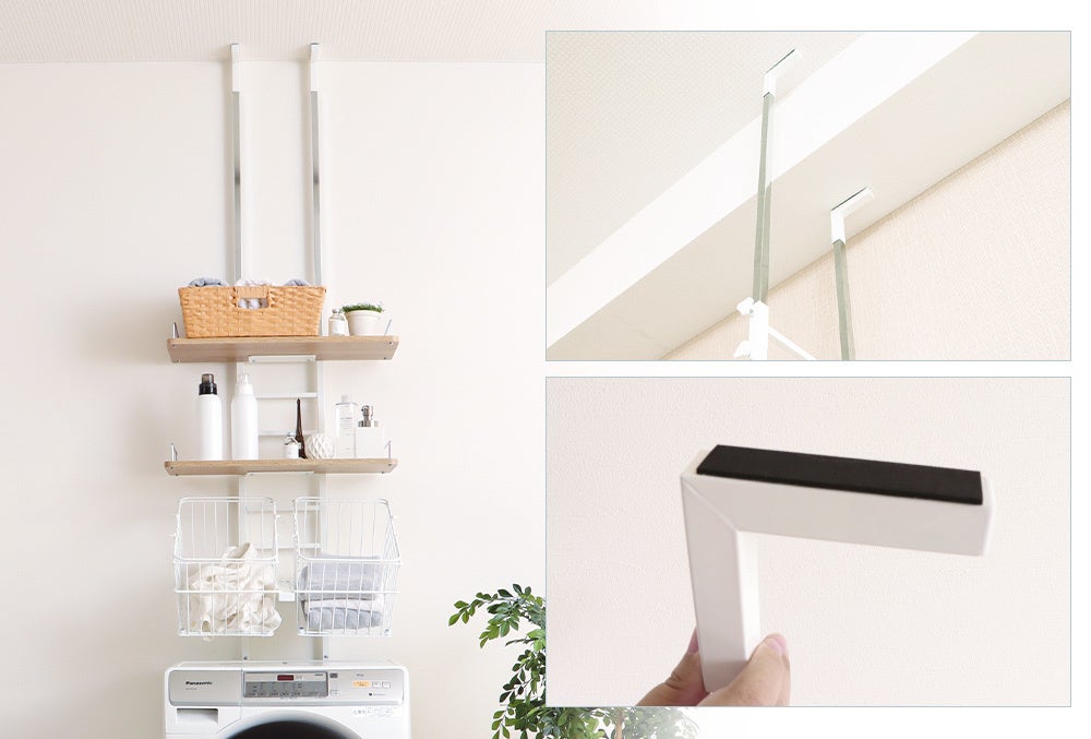 上部の伸縮部分は左右別々に調節できるので、段差のある天井でも設置可能です。天井への傷つき防止と滑り止めを兼ね備えたフェルト付きなので安心してご利用いただけます。