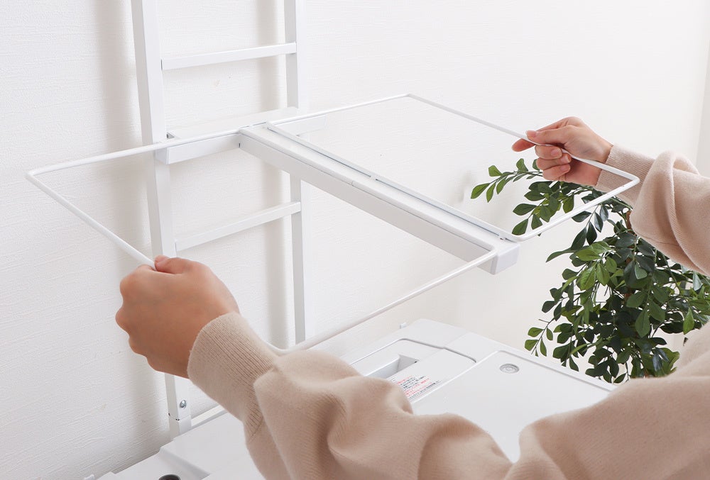 可動式の棚板は、2枚付属しています。棚板は、支柱のラダー部分に引っ掛けるだけで簡単に取り付け、取り外しが出来ます。棚の高さは、8段階に調節できるため、ラック下に設置する洗濯機など様々なサイズに対応出来ます。棚板にはスチール製の桟を取り付け置いたものが落ちないように工夫しました。これで洗濯機の振動なども安心です。また、桟を逆さに設置すればタオル掛けにできたり、桟にS字フックを掛けるなど様々な用途にご利用いただけます。