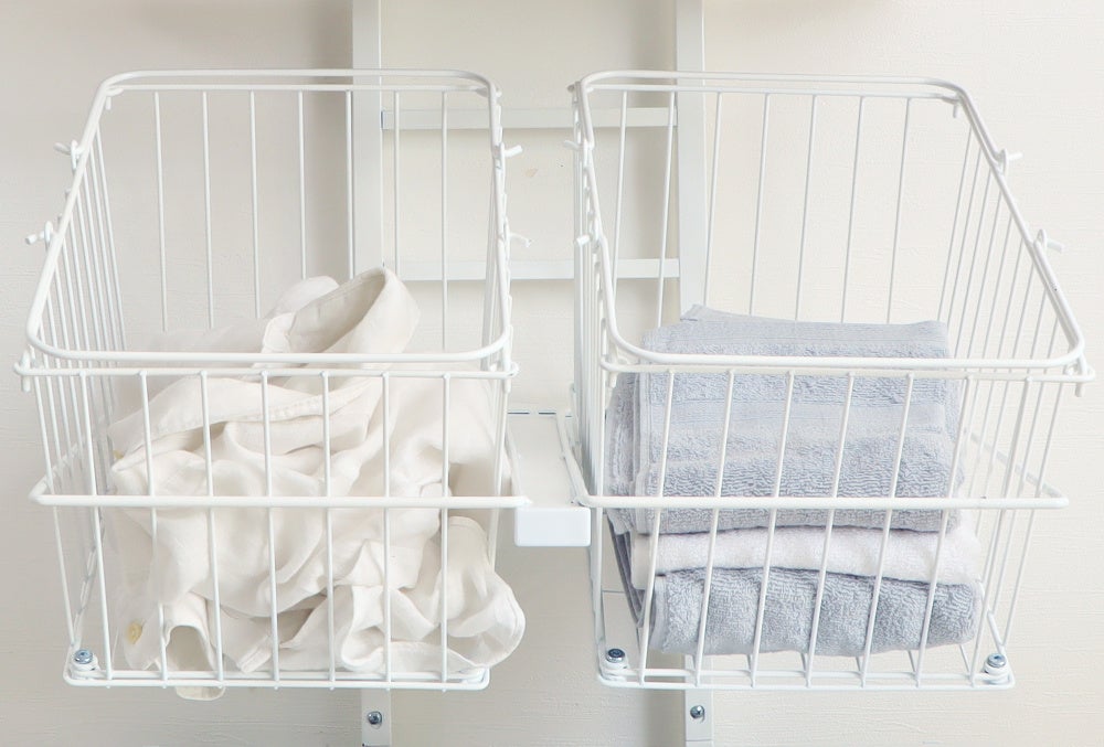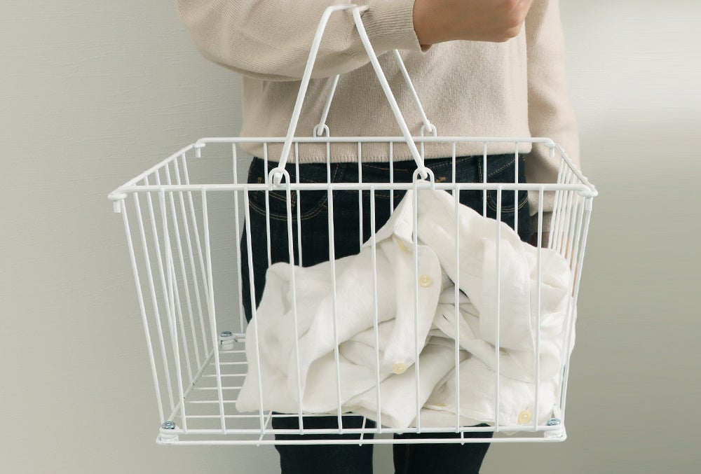 真っ白なワイヤーバスケットを2個お付けしました。バスケット用のフレームも可動式となっており、棚板同様、使いやすい高さに調節することができます。バスケットを斜めに設置することで、出し入れしやすく、浮かせることで通気性もアップ。衛生的にお使いいただけるよう工夫しました。持ち運べるバスケットが便利です。