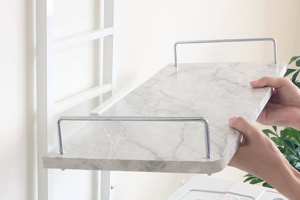 清潔感ある真っ白な支柱に、アクセントとなる棚板は同柄2柄をお付けしています。