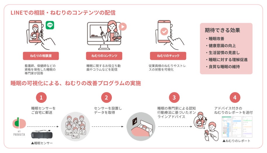 1:睡眠セミナーの受講 2:日々の睡眠状況を計測 3:オンラインによる睡眠改善アドバイスを提供(2回) 4:ねむりのコンテンツの配信(LINE) 5:ねむりの相談室(LINE) |