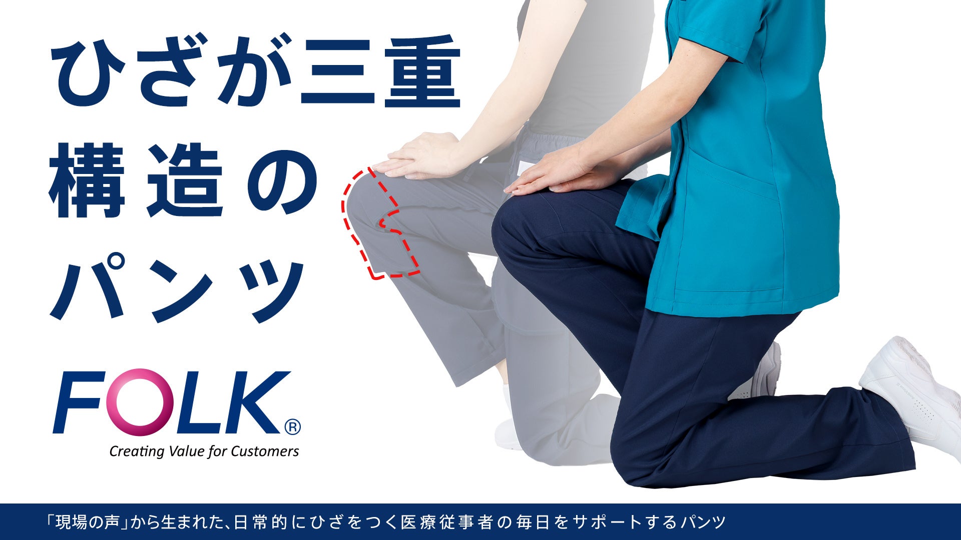 ユニフォームメーカーのフォーク株式会社(創業121年、本部:東京都千代田区、代表取締役:小谷野淳)は、2024年5月15日、医療現場の膝をつく動作に対応した「ひざ三重パンツ(6023SC)」をフォークプライベートブランドより発売しました。人気の定番カラー、ダークネイビーとバーガンディの2色を数量限定、フォークオンラインストア限定で販売します。本商品は膝をつくことが多い動物病院看護師の方の「膝に穴が開きやすい」という声をきっかけに、ヒアリングと着用テストに協力をいただきながら開発しました。