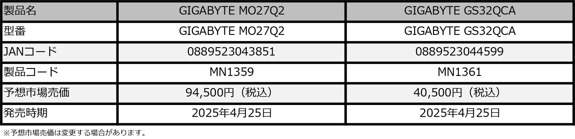 株式会社ニューエックス(本社:東京都千代田区)は、取り扱いメーカーGIGABYTE社よりゲーミング液晶モニターのQD-OLEDモデル「MO27Q2」と1500R曲面パネルのWQHD解像度高リフレッシュレートモデル「GS32QCA」の2製品を2025年4月25日(金)より発売いたします。