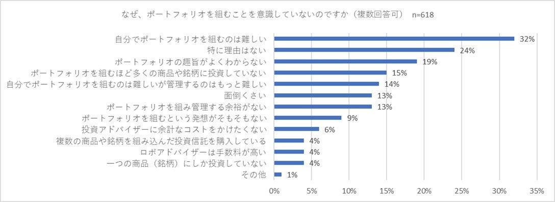 最後に、資産運用の際にポートフォリオを組むことを「意識していない」と回答した618名に「なぜ、ポートフォリオを組むことを意識していないのですか」(複数回答可)と尋ねました。最も多い回答は「自分でポートフォリオを組むのは難しい」(32パーセント)となりました。2位は「特に理由はない」(24パーセント)、3位は「ポートフォリオの趣旨がよくわからない」(19パーセント)でした。個人でポートフォリオを組むことの難しさを指摘する回答が多かった一方で、ポートフォリオの重要性を認識していない方も相当数いることが明らかになりました。