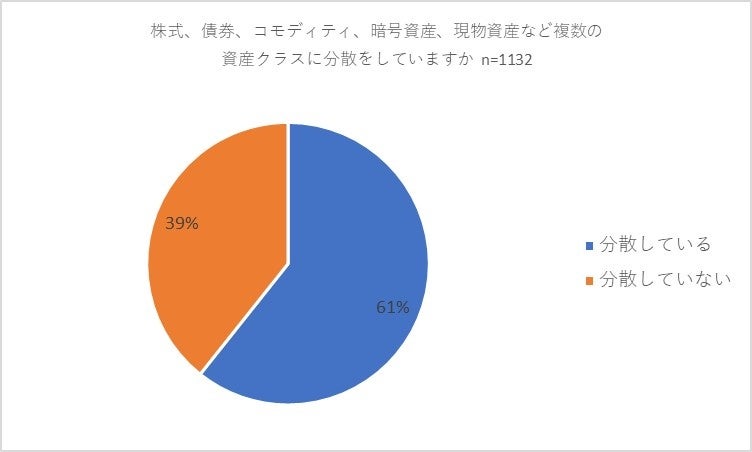 次に資産運用を「行っている」と回答した1,132名の方に「株式、債券、コモディティ、暗号資産、現物資産など複数の資産クラスに分散をしていますか」と尋ねたところ、61パーセントが「分散している」、39パーセントが「分散していない」と答えました。