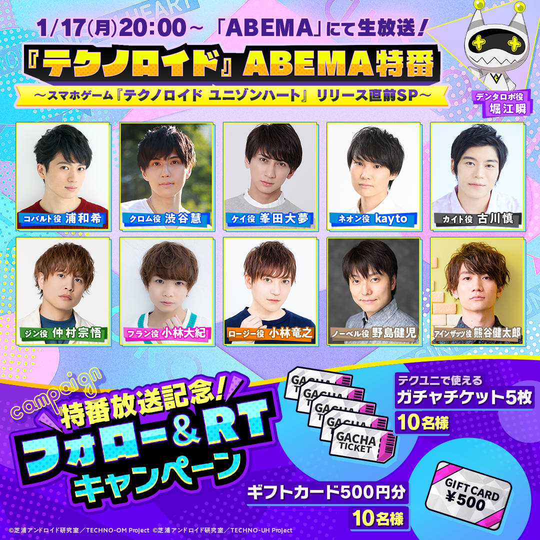 公式Twitterにて、「『テクノロイド』ABEMA特番〜スマホゲーム『テクノロイド ユニゾンハート』リリース直前SP〜」の放送を記念して、フォロー&RTプレゼントキャンペーンを実施いたします。