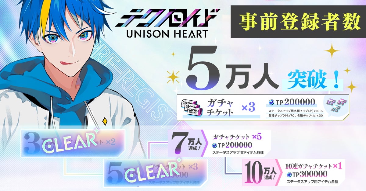 「kokoro」を育むパズルアドベンチャー『テクノロイド ユニゾンハート』(略称:テクユニ)はこの度、事前登録者数5万人を突破いたしました。引き続き事前登録を受け付けており、事前登録者の人数に応じて豪華アイテムをゲーム開始時にプレゼントいたします。ぜひこの機会にご登録ください。