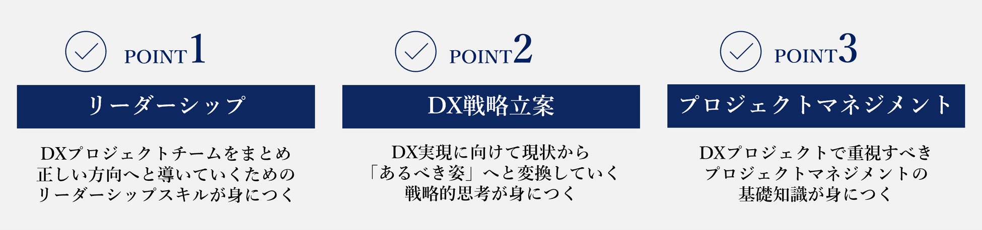 本プログラムでは、DX推進リーダーに必要な 「リーダーシップ」「DX戦略立案」 「プロジェクトマ