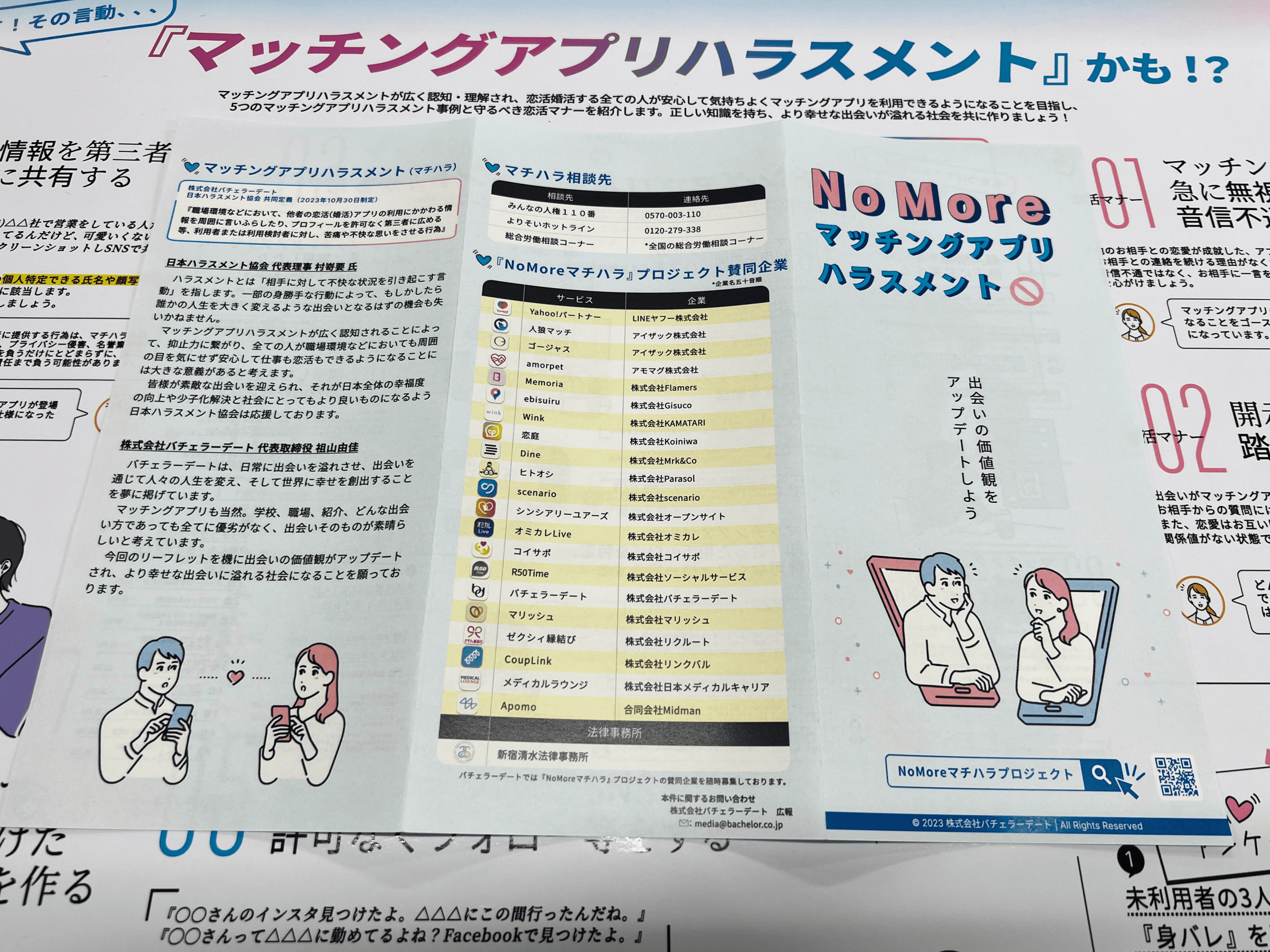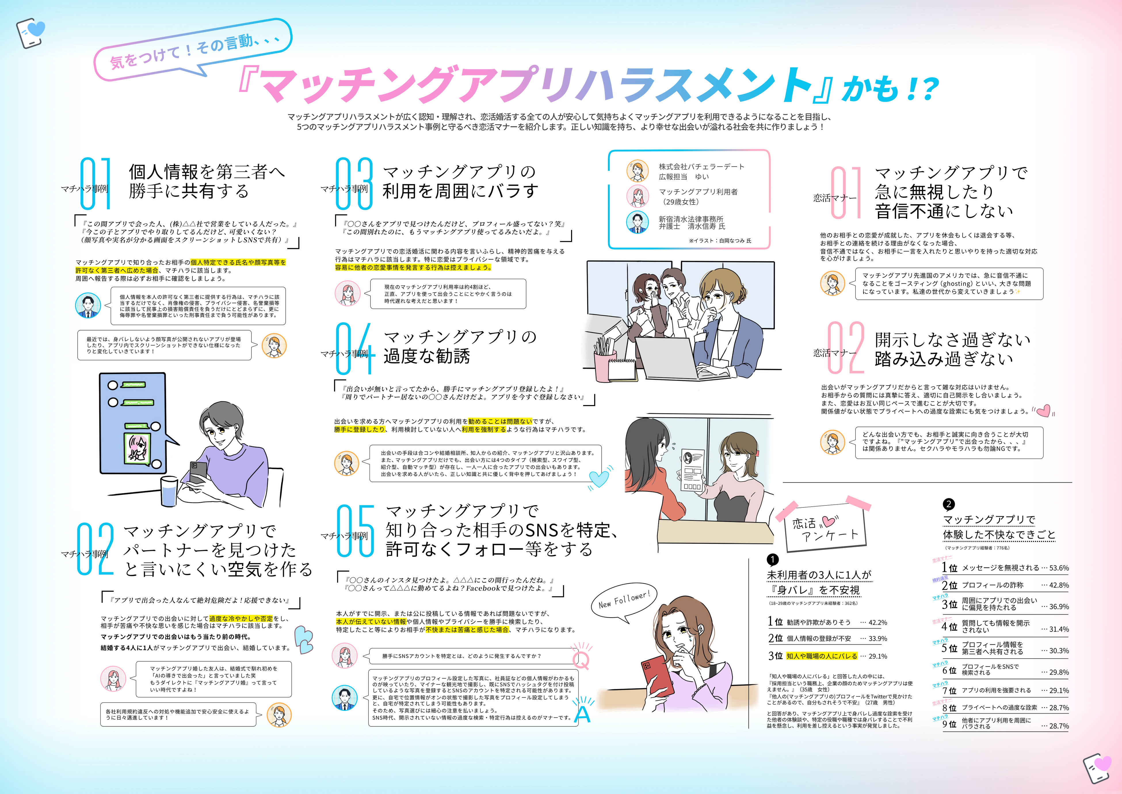日本ハラスメント協会代表理事、新宿清水法律事務所様の協力を得て、本リーフレットでは5つのシチュエーション事例や対処方法、相談先などを掲載。どのようなことがマチハラに当たるのか、度を超えると法的な責任も課される可能性があることなどを分かりやすくまとめています。またマチハラには該当しませんが、今回の調査で1位だった「メッセージを無視される」行為は、マッチングアプリ先進国アメリカではゴーズティング(ghosting)と呼ばれ、大きな問題となっています。そこで、認識すべき利用時の恋活マナーとしても紹介しています。