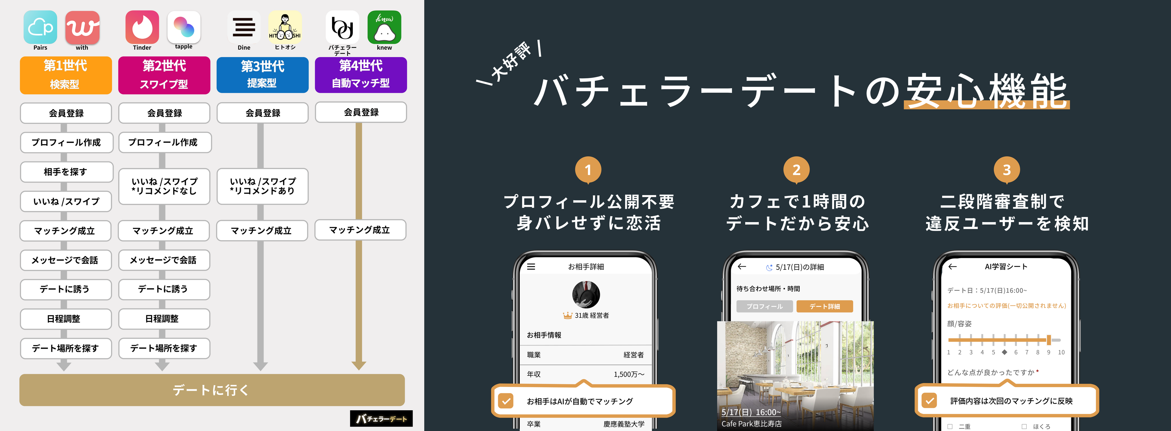 業界初、毎デート後の相互評価による二段階審査制を採用。ユーザーの質が担保できる為、安心安全に利用可能。評価を元にAIが作成する恋愛成績表「バチェラーレポート」も人気。デート中の会話や振る舞いなどが可視化でき、新しい発見や自信に繋がります。 累計デート人数30万人突破!関東・関西をはじめとする全国7都市で展開中。