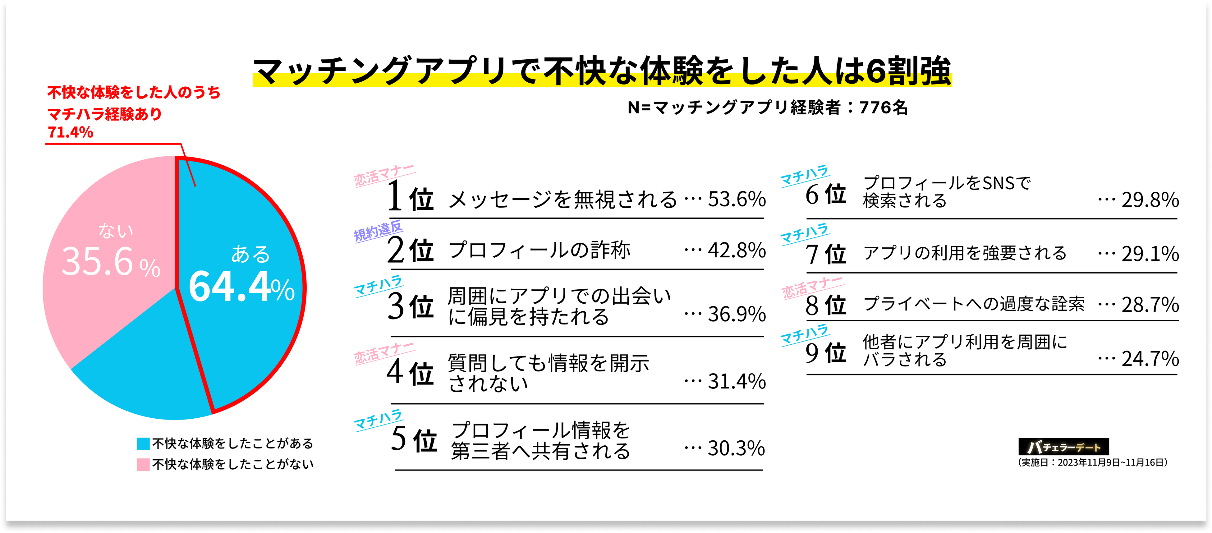 そして今回、全国のマッチングアプリ利用経験者10〜40代の男女776名に対し、体験した不快な出来事について調査しました。その結果、実際に約64%の人が何かしらの不快な体験をしたことがあると判明しました。