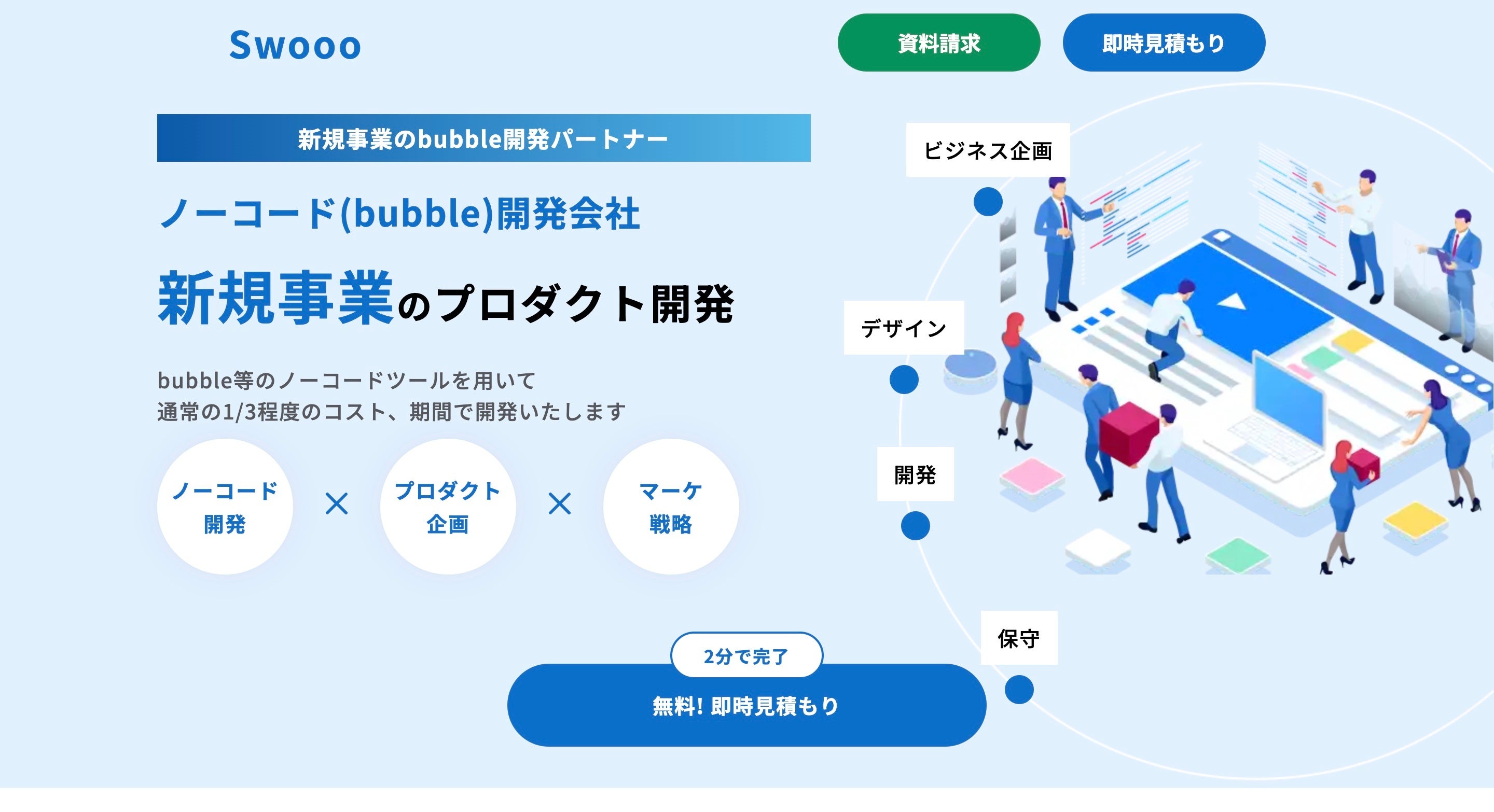 Swoooは、システム開発を「早く・安く」実現できるサービスです。