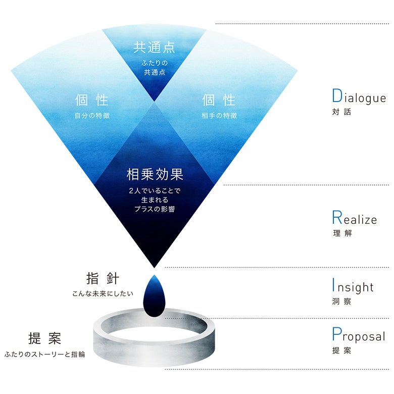 SORAでは、心の奥底からのぞむ生き方を、これからの「指針」として指輪に込め表現するために、「指針」を抽出するオリジナルのヒアリング手法「DRIP」を用いて指輪のデザインをご提案しています。DRIPには4つのプロセスがあり、それぞれの頭文字をとってDRIP(ドリップ)と名付けられました。Dialogue(対話)、Realize(理解)、Insight(洞察)、Proposal(提案)です。これらのプロセスを通じて、二人の相乗効果に焦点をあて、未来への想いをドリップ(抽出)していきます。