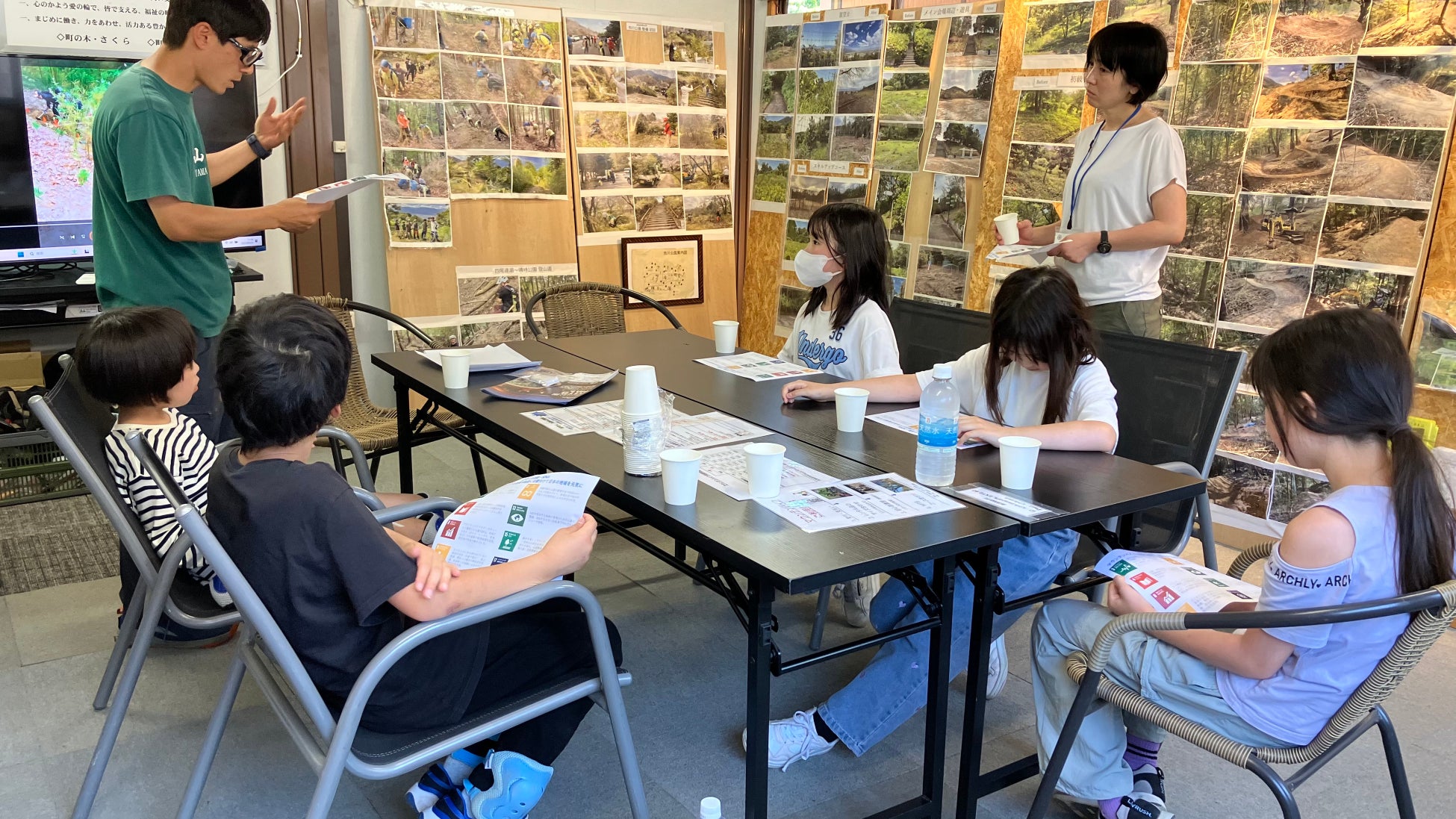 児童たちはこの場所で、マウンテンバイクの基本操作やコース走行を体験した後、MTBに乗って再生された公園内を巡りました。その後は管理事務所にて、山守人の活動を写真・資料・映像を交えて紹介。すべての山守人の活動がSDGsに直結していることを、具体的な事例を通じて解説しました。