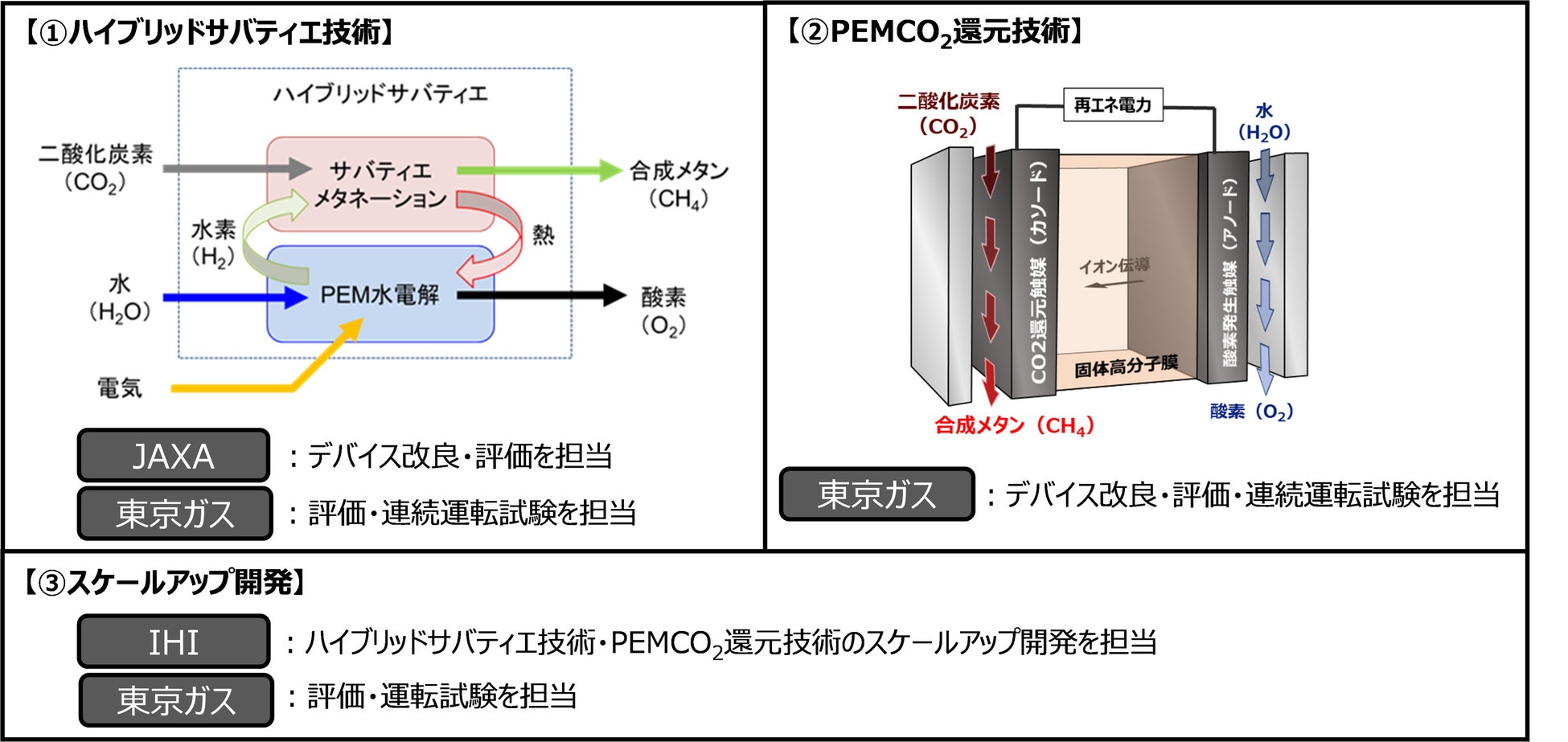 ②PEMCO₂還元技術:PEM(固体高分子膜)を用いて,水とCO₂から直接メタンを合成