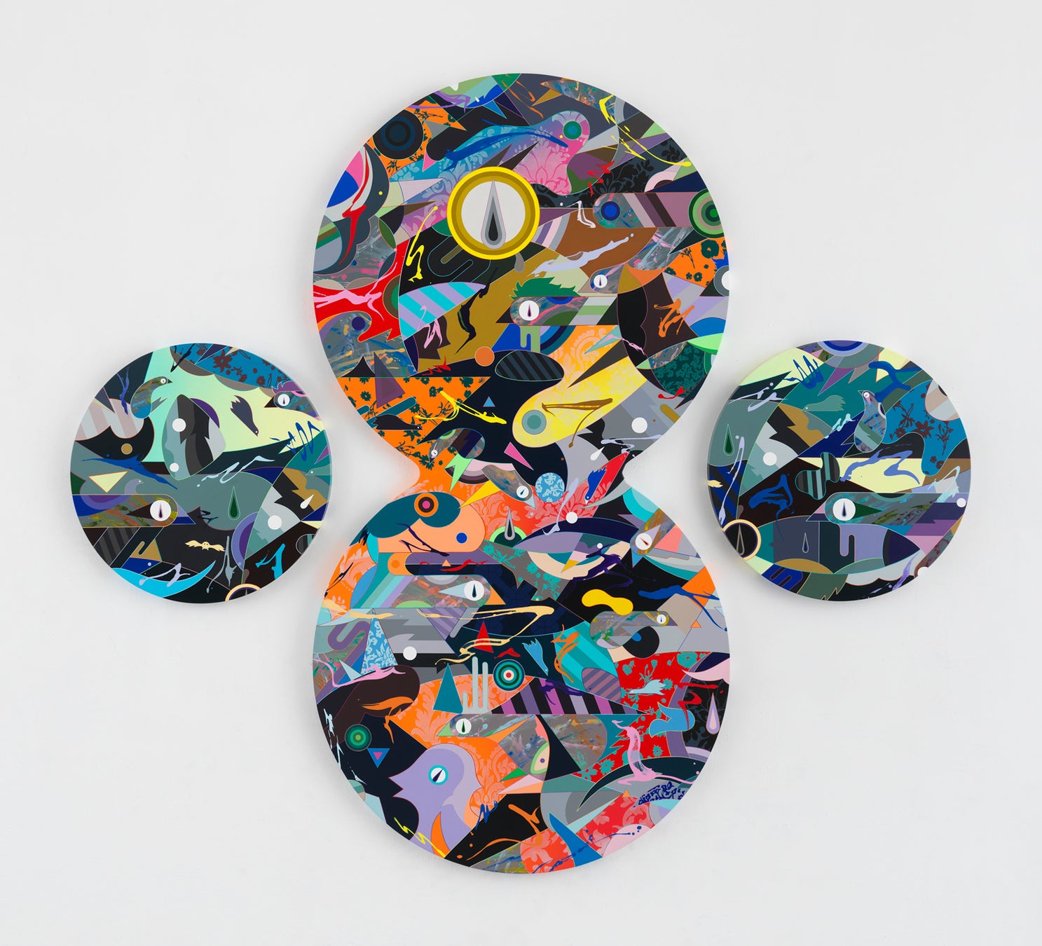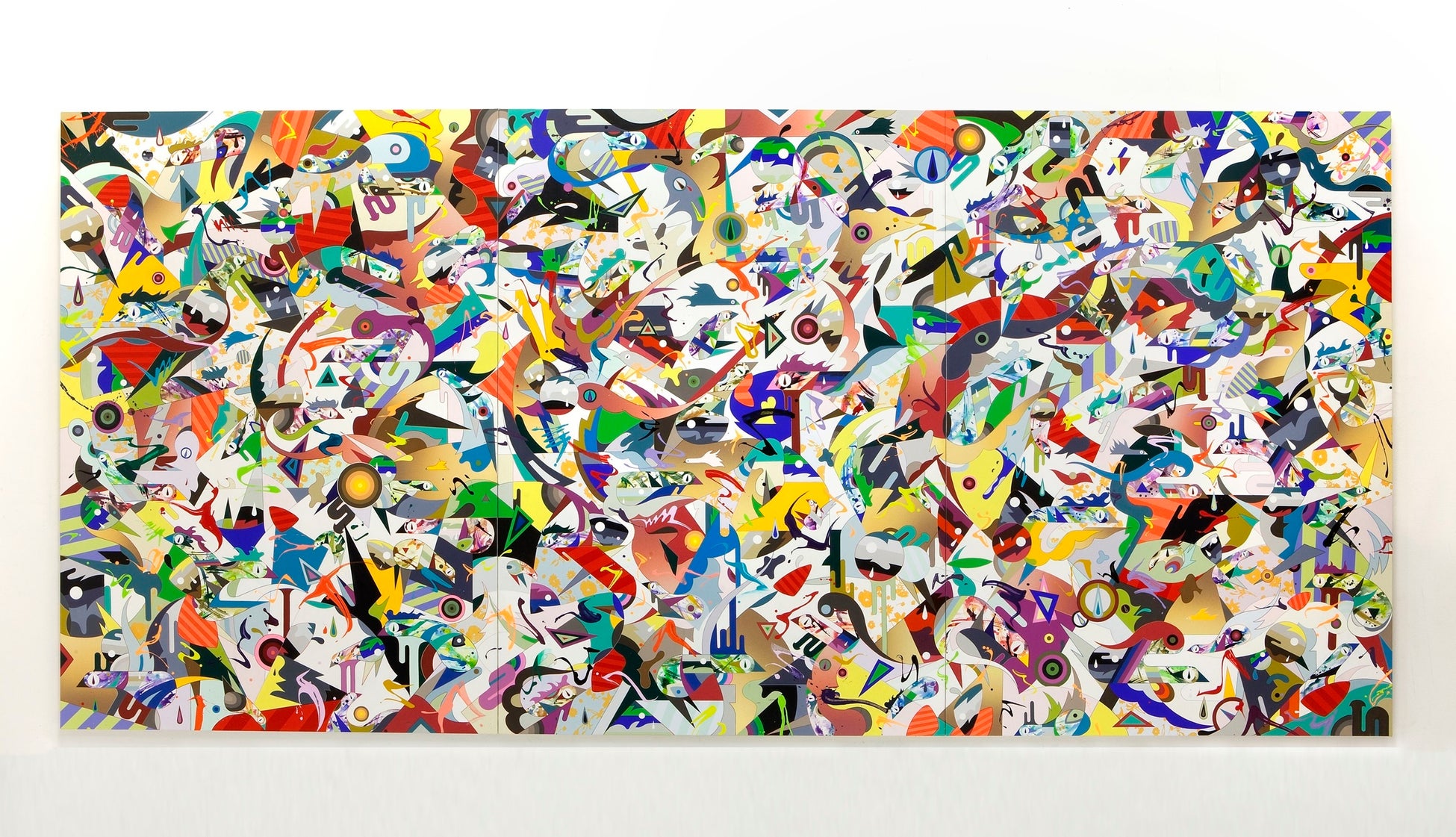松山の絵画から放たれる眩いばかりの色彩は最大の特徴の一つ。自身で作った何千という色のストックが様々な技法によって、キャンバスの上で共鳴します。世界を彩る多様な文化、伝統、宗教、そして歴史的なものや現代的なもの、さらにはハイカルチャーから日常品といった要素は、松山によって無数の色で描かれ、情報化の中で移ろう現代社会の姿を映し出し、混然一体となって鑑賞者を色彩の世界に没入させます。