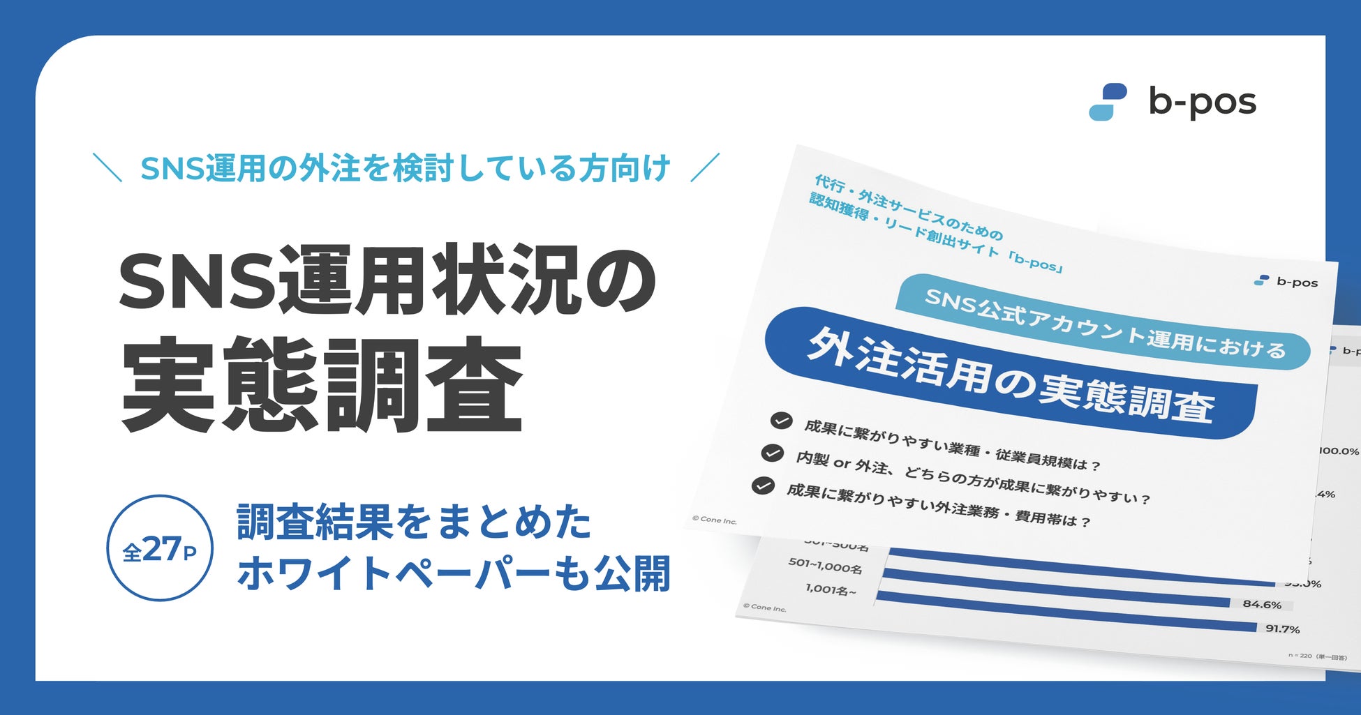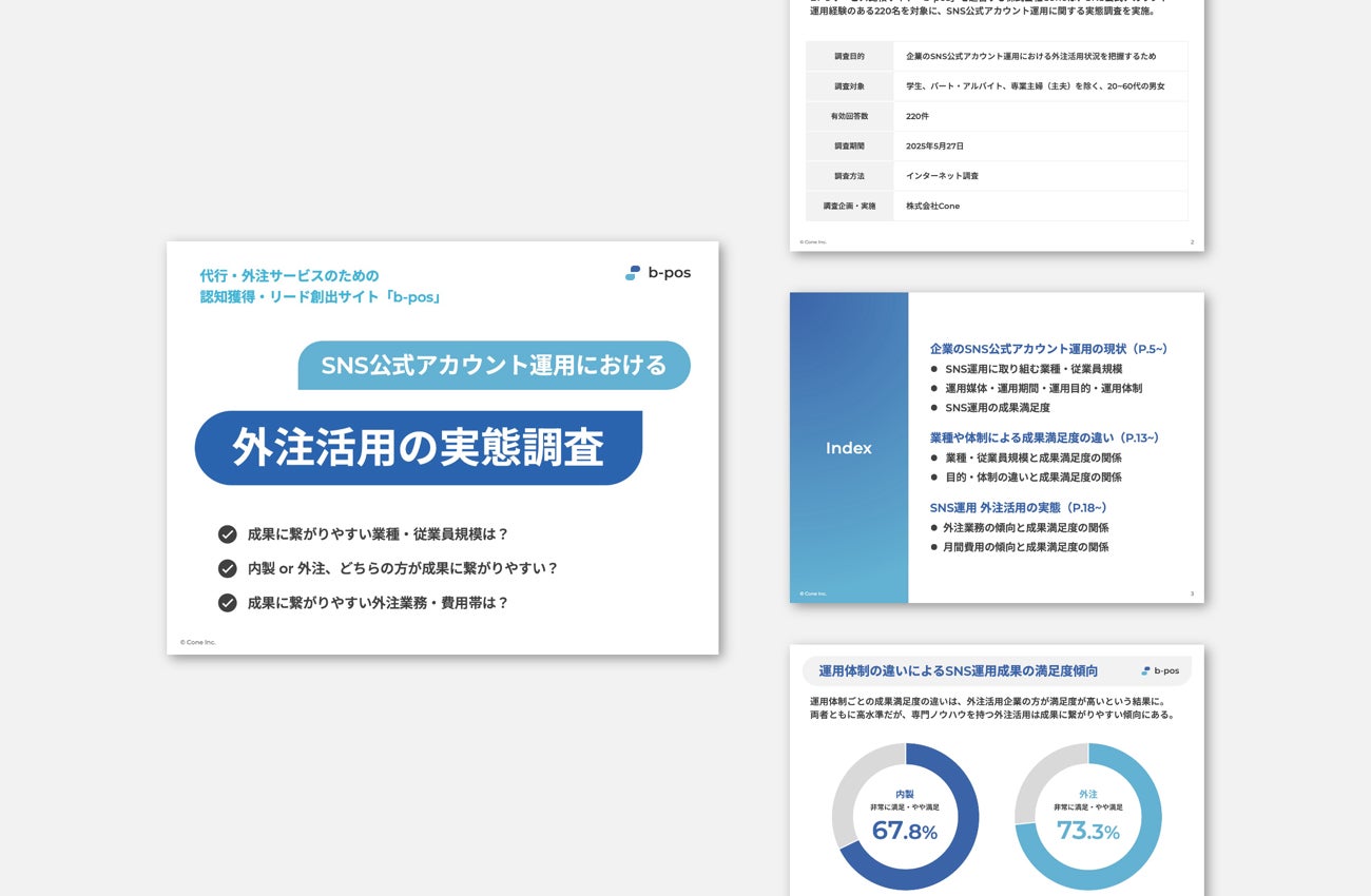 最適な代行・外注サービス選定をサポートする、BPOサービス比較サイト「b-pos」を運営する、株式会社Cone(本社:大阪府大阪市、代表取締役:佐藤 立樹、以下「当社」)は、企業のSNS公式アカウント運用における外注活用の実態調査を実施し、調査内容をまとめたホワイトペーパーを公開しました。本調査では、内製運用よりも外注活用企業の方が成果満足度が高い、月間20万円~50万円の費用帯で外注している企業の成果満足度が最も高いなどの事実が明らかになりました。