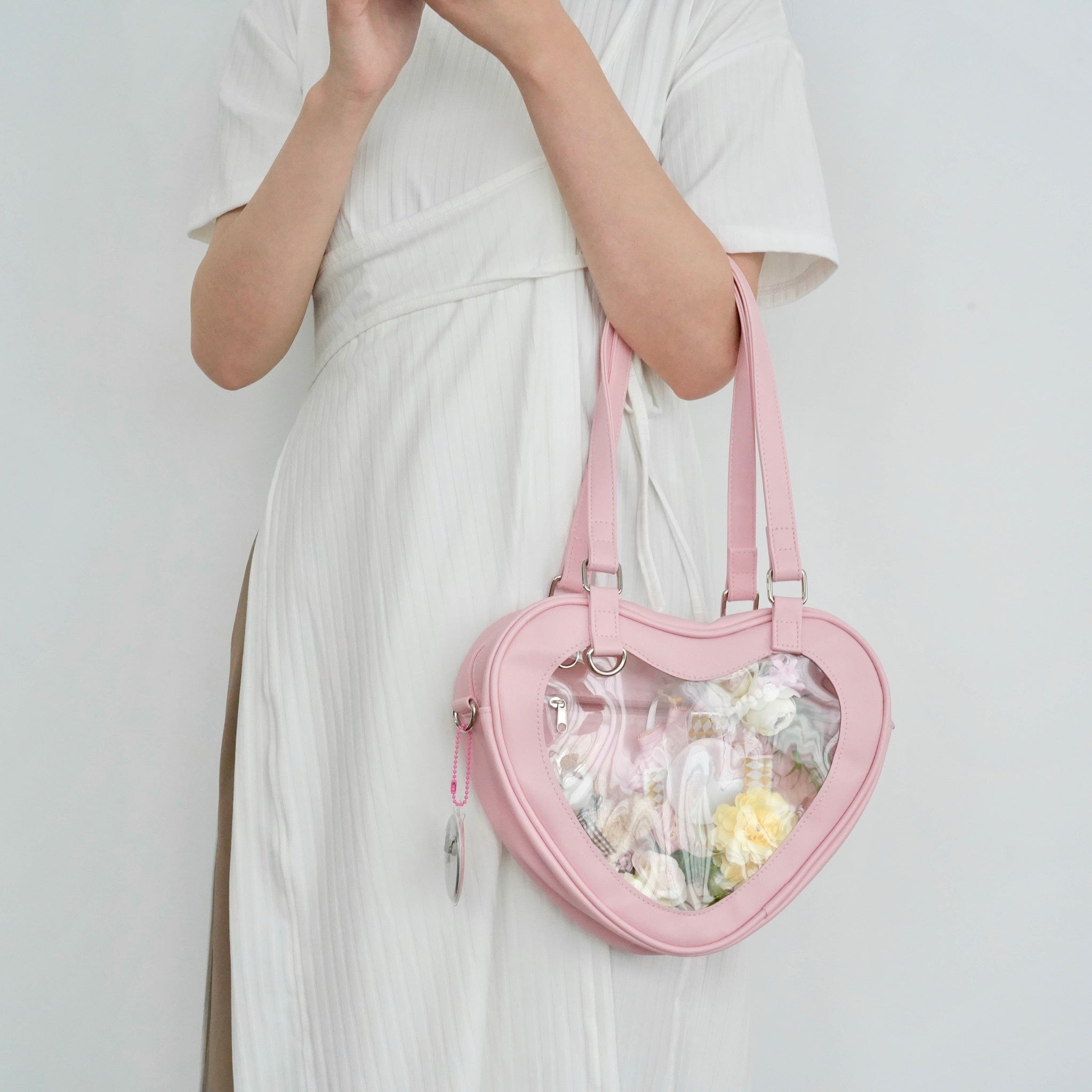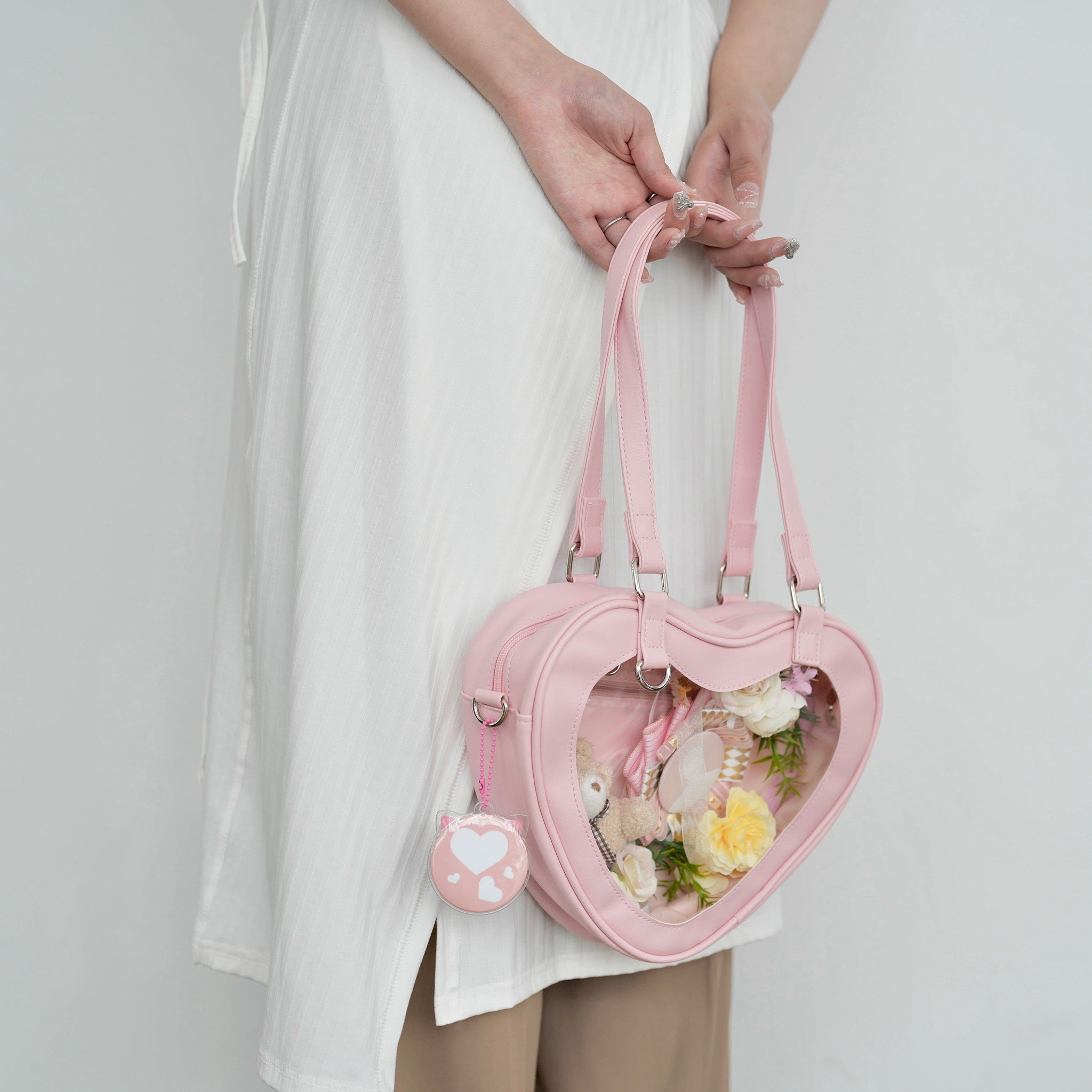 2way仕様のストラップが付いたハート型のバッグです。正面にはクリア窓付きで、バッジやぬいぐるみなどのグッズを飾れます。