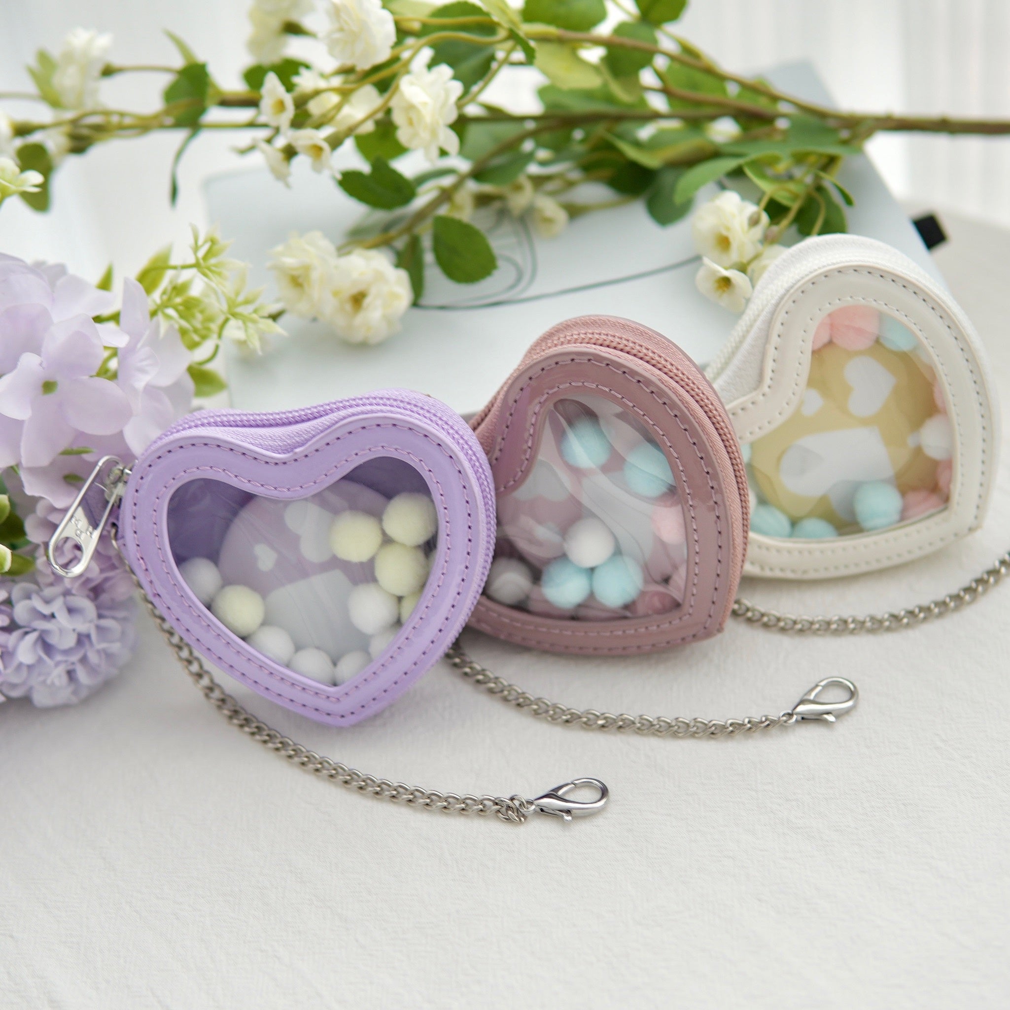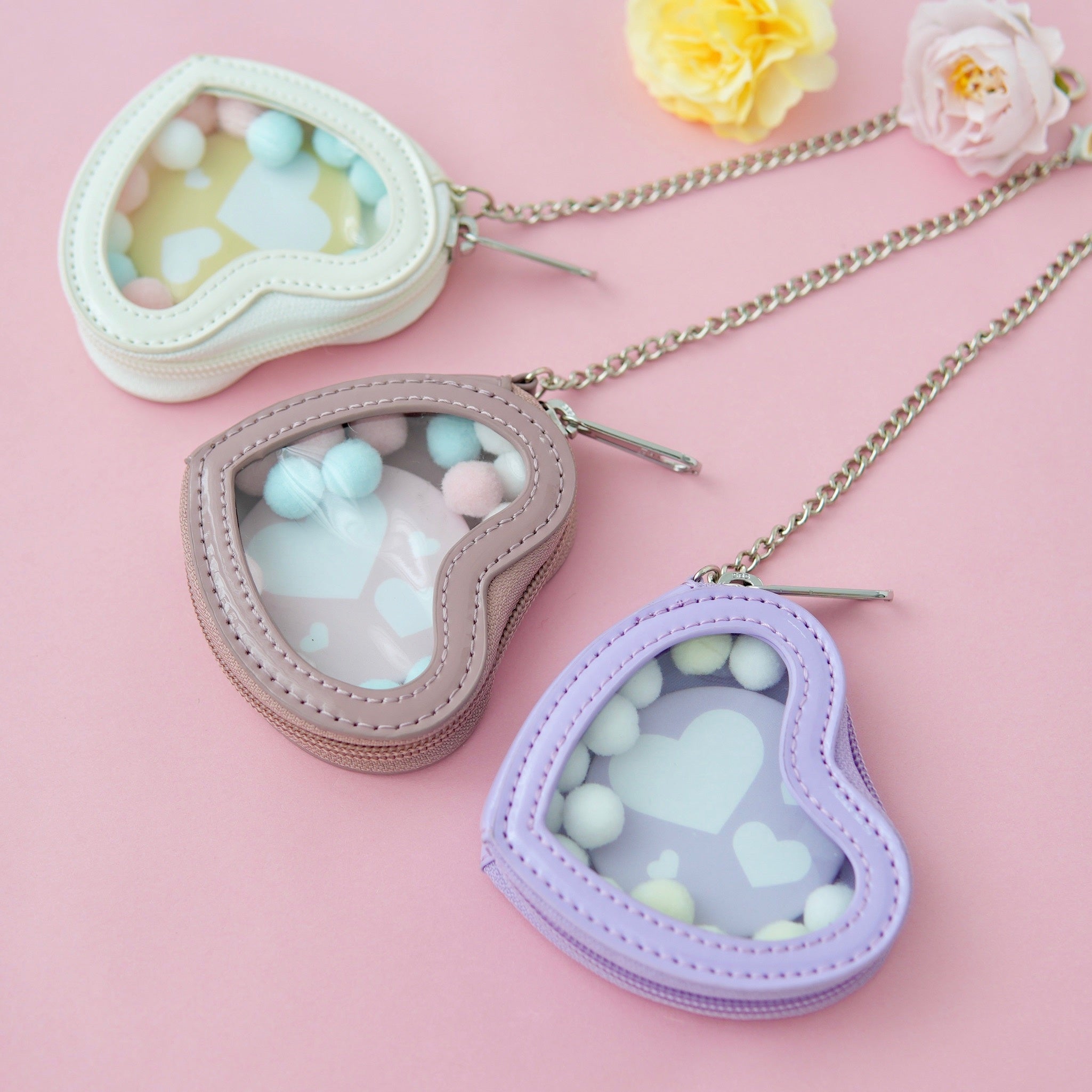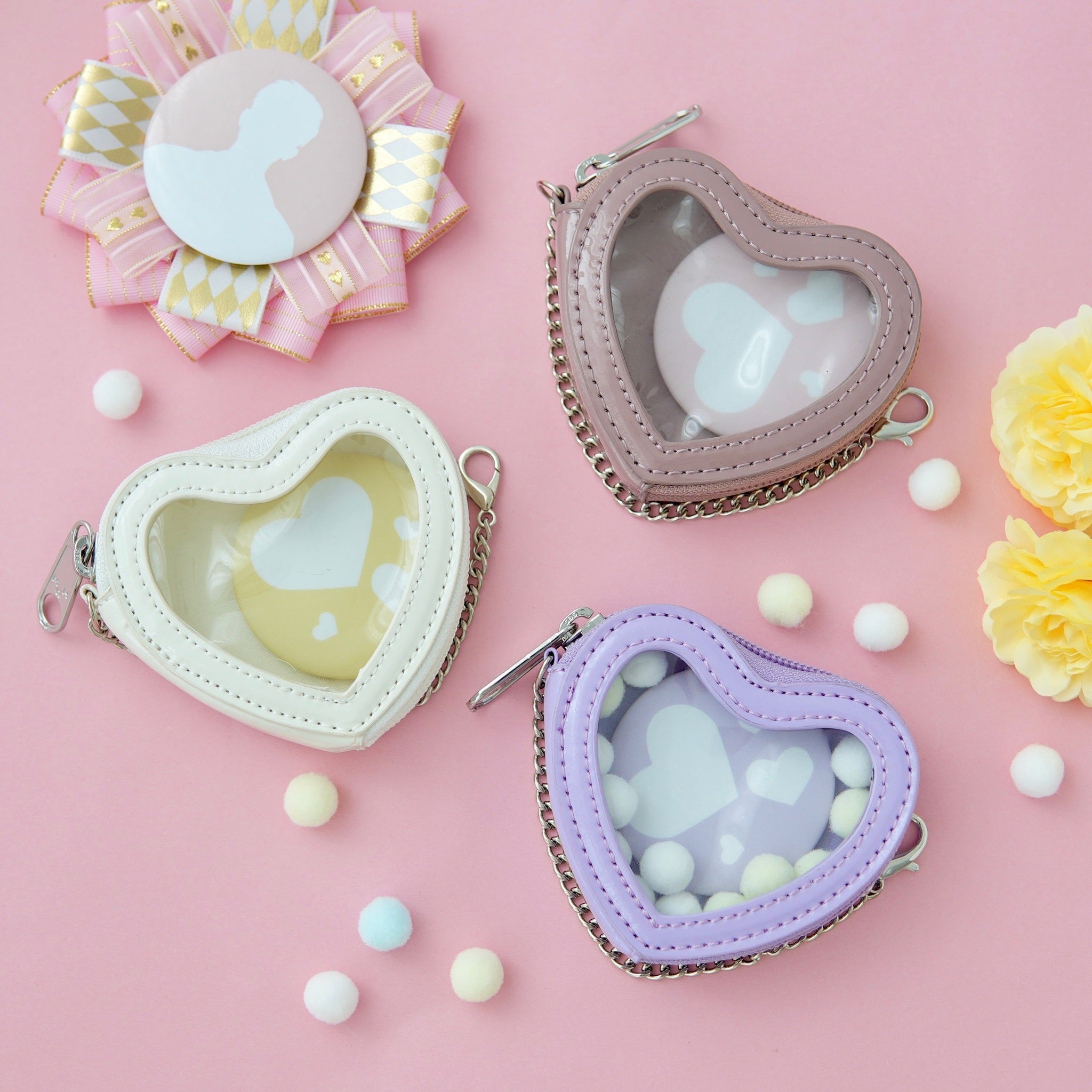 クリア窓で中身が見えるハート型のミニポーチです。チェーン付きでバッグに取り付けられます。チャームとしても可愛いころんとしたハートは、缶バッジなどの小さなグッズや普段使いのイヤホンなどにぴったりです。