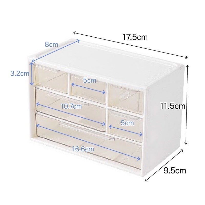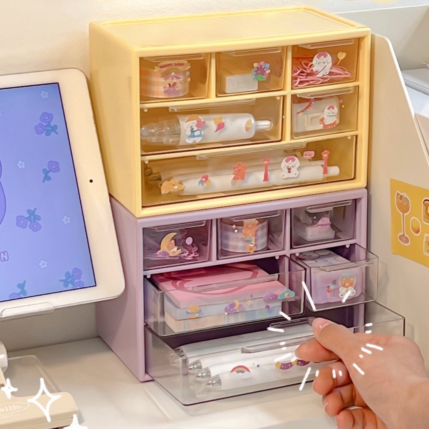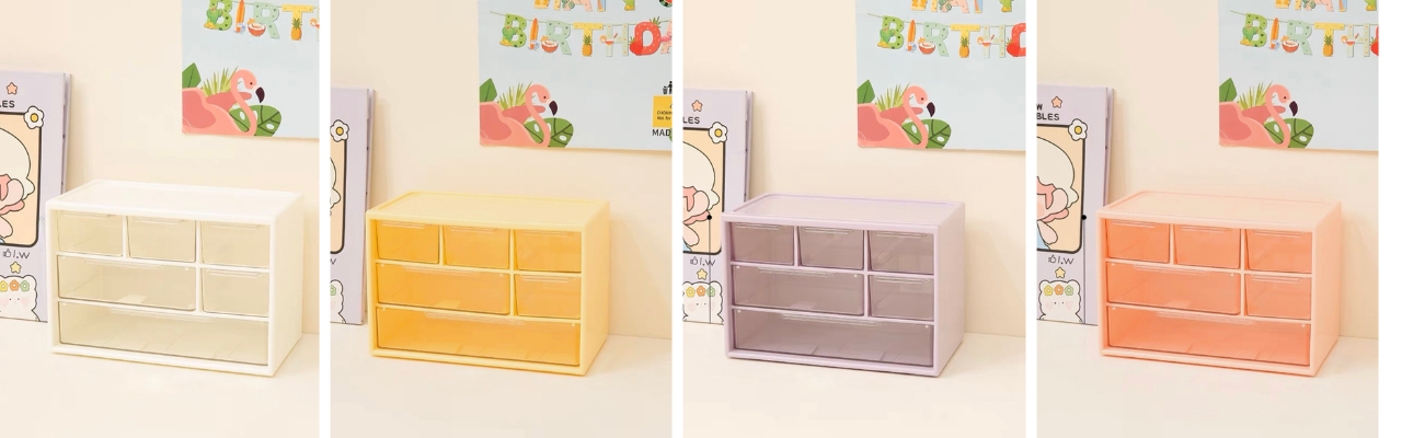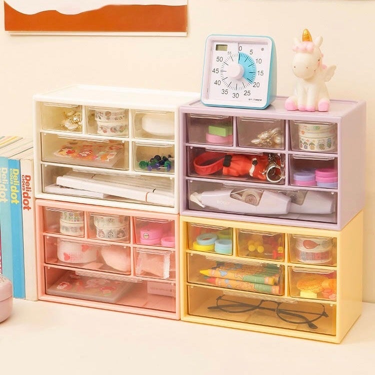 大きさの異なる4つの引き出しが付いた小さな収納ボックスです。細かなものから少し大きなものまで特徴に合わせて整理できます。シンプルな見た目はステッカーなどでアレンジも可能で、同色を重ねたり色違いで組み合わせたりしても可愛いデザインです。