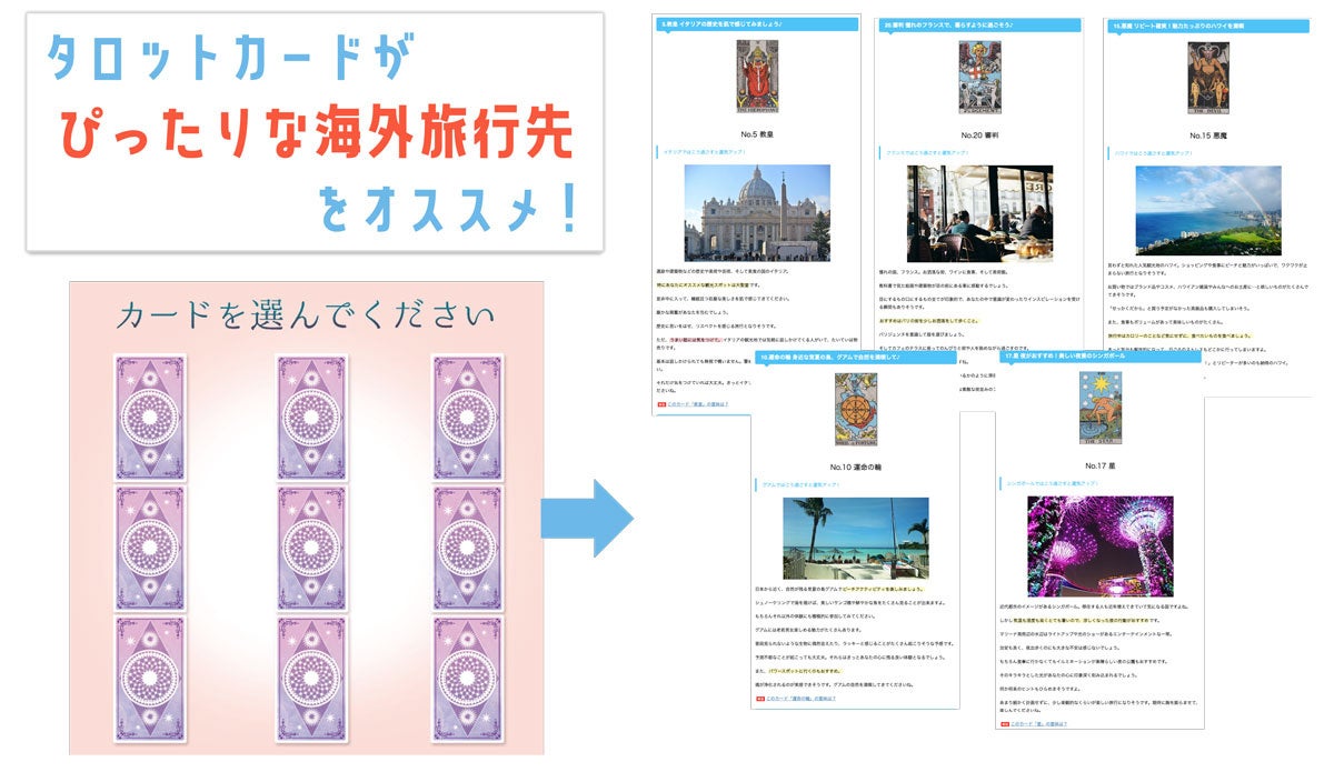 利用者は、今、運勢上もっとも楽しめるピッタリな海外旅行先をタロットで占うことができます。なぜ今、利用者にとっておすすめの場所なのか、その場所でどう過ごすことが最適かなどを解説。旅行先を悩む人にとって占いを使った提案を受けることが可能です。
