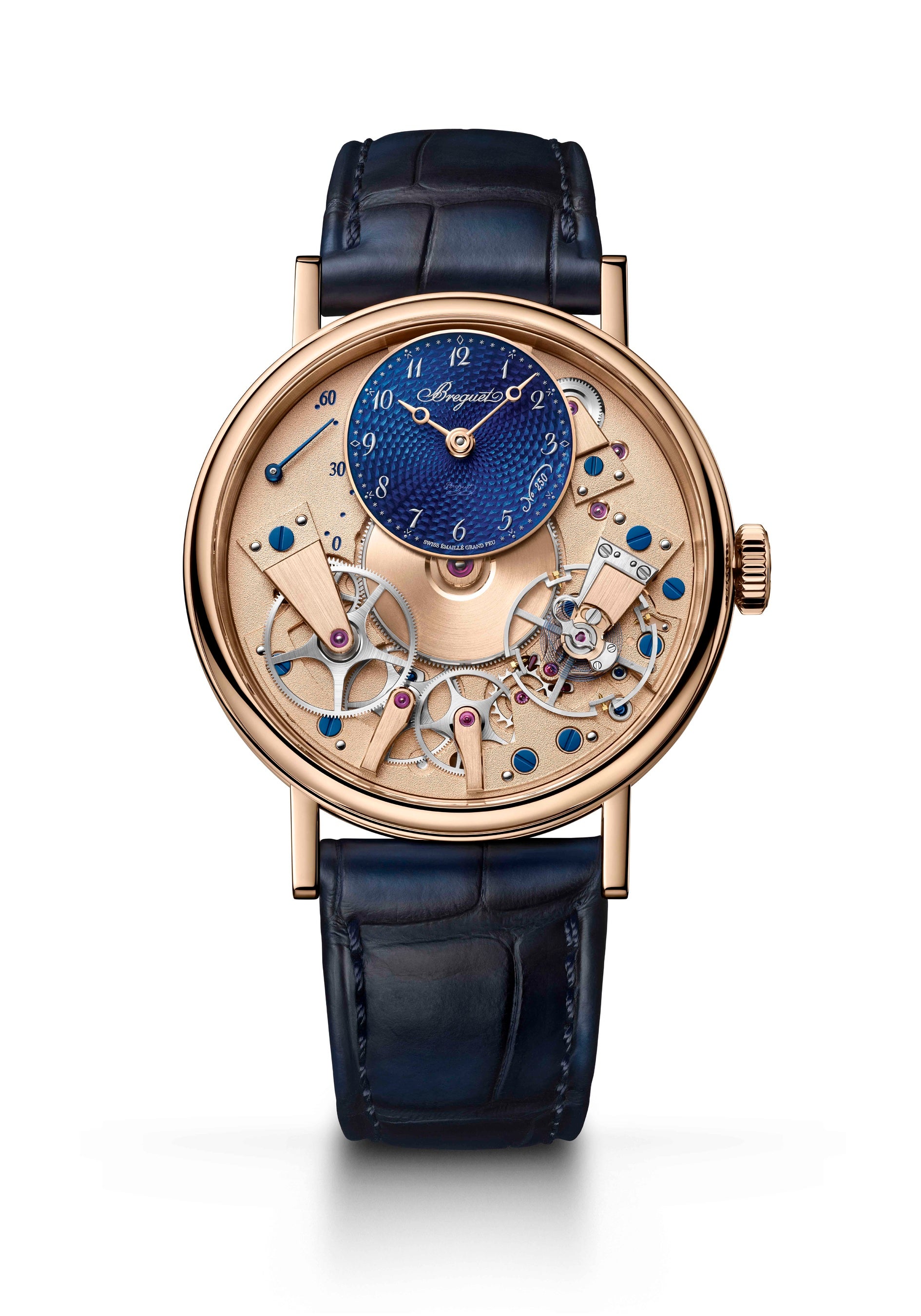 まったくシンプルな外観をもって時を告げる時計、「スースクリプション ウォッチ」と「モントレ・ア・タクト」の2つから想を得て2005年に誕生した「トラディション」コレクションは、輪列やブリッジを露わにして、ムーブメントをミニチュアの傑作に仕立てた独特の建築構造が特徴です。このレイアウトは、アブラアン-ルイ・ブレゲが作った時計からの着想と容易に判別でき、時計職人がケースを開けた際に見ることが可能な技術的機構を同じく眺めることができます。