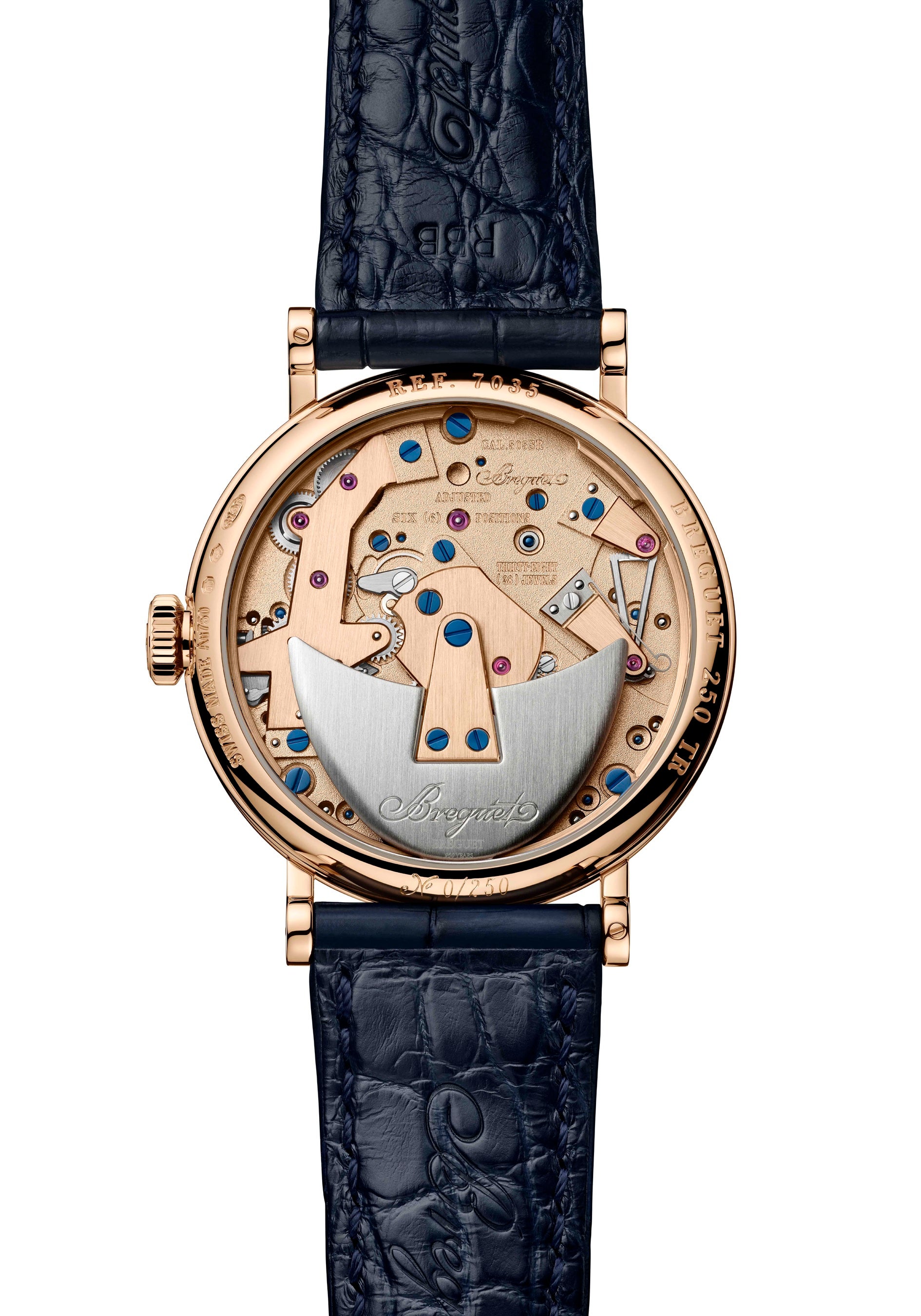 250周年に合わせてブレゲは独自の合金、ブレゲゴールドを発表しました。クラッシクコレクションの「スースクリプション 2025」にまず取り入れられたブレゲゴールドが、今回世界限定250本で展開される「トラディション7035」のケースに採用されます。暖かい色調のゴールドは、ムーブメントの構造全体を強調し、ブルーの半透明グラン・フー エナメルで彩られたギヨシェ彫り文字盤に備わる時針と分針の表示や、10時と11時の間に設けられたレトログラードセコンドを際立てています。