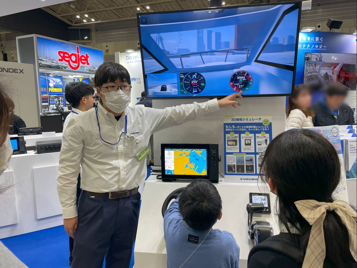 さらに当社の最先端の技術に触れることのできる展示として、新製品「NavNet TZtouchXL」の機能をVR空間で体験できる「3D操船シミュレーター」を展示します。VR空間と機器が連動しているため、海岸線や他船の動向をプロッタやレーダーで把握でき、実際に海の上にいるかのように操船体験が可能です。また、天候や時間などを自由に切り替えることができるため、夜間や悪天候時の航海における航海計器の利便性や安全性を実感できます。
