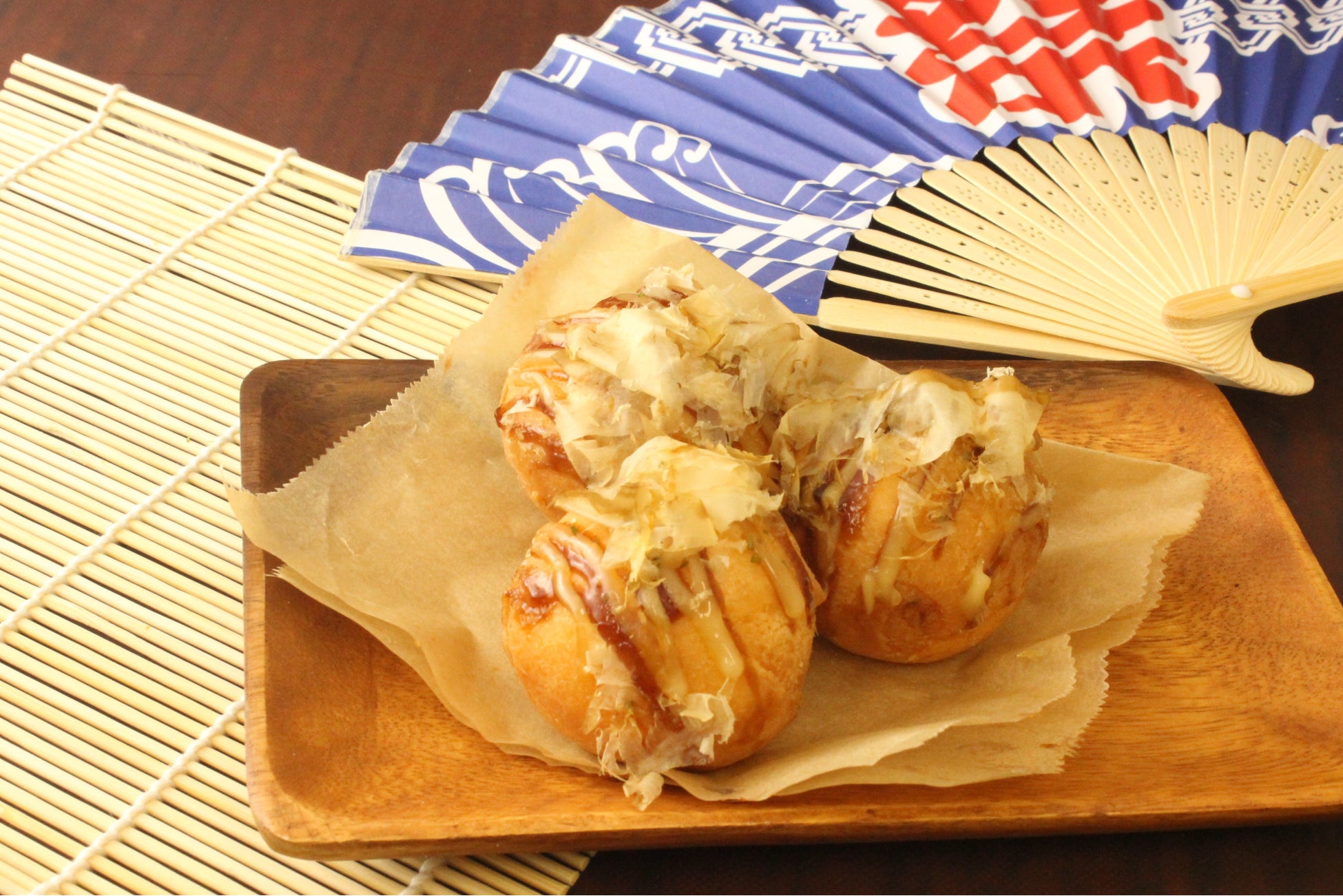 外はさっくり、中はもちっとした食感のドーナツに、ソースとマヨネーズとかつお節をトッピング。見た目はまさにたこ焼き!つい騙されちゃうかも!?