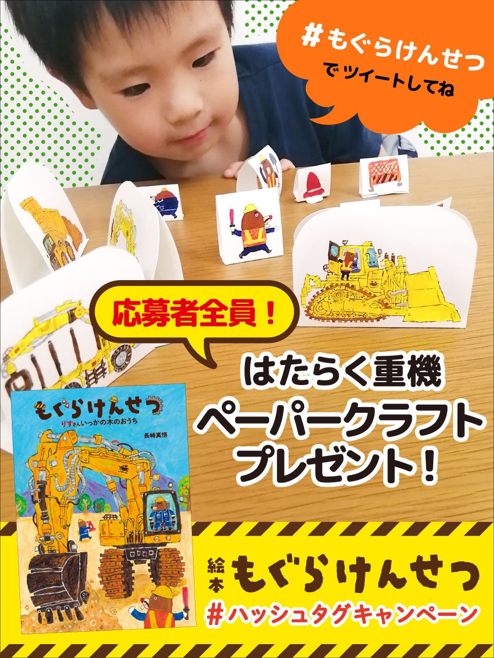 新刊絵本『もぐらけんせつ』の刊行を記念して、応募者全員に「はたらく重機のペーパークラフト」をプレゼントするハッシュタグキャンペーンを実施します。